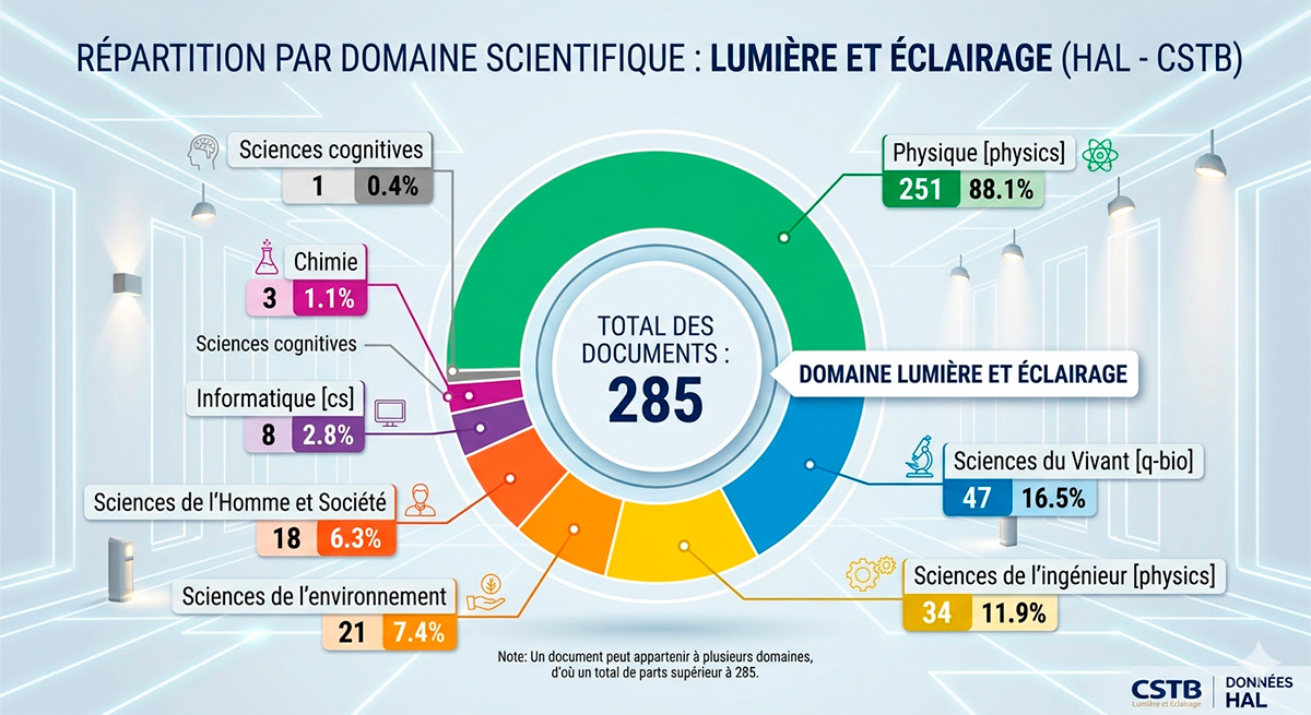 Avec 88 % des publications, la physique occupe une place centrale dans l’archive HAL « Lumière et Éclairage » du CSTB. Cela confirme que l’éclairage repose d’abord sur la photométrie, l’optique et la thermique. Ces bases sont indispensables pour évaluer les LED, le flux lumineux ou l’éblouissement.