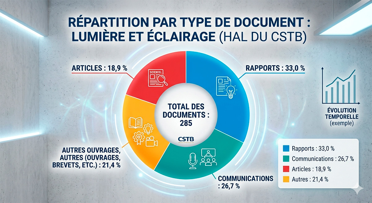 Le corpus « Lumière et Éclairage » sur HAL a une prédominance technique. À eux seuls, les rapports et les communications de congrès représentent 60 % de la production totale. Ce qui souligne le rôle d’expert-conseil du CSTB.