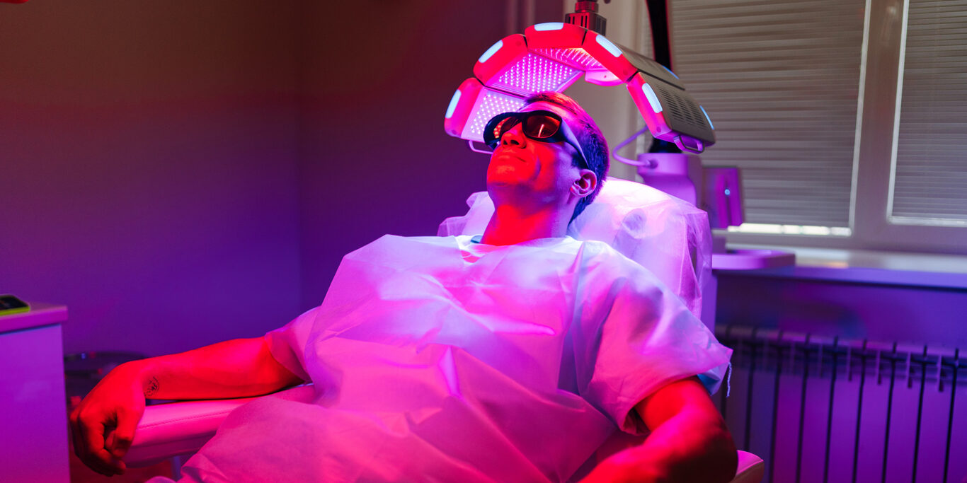 Photo en tête de l’article : Photomédecine, quel avenir pour la lumière dans la santé – Thérapie photobiomodulation PBM sur les cheveux, homme, lumière rouge et bleue © dikushin, iStock