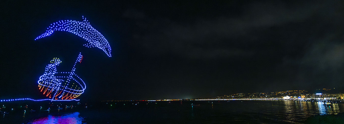 En France, rappelez-vous : l’arrivée de la flamme olympique à Marseille en mai 2024. Voici une autre collaboration du Groupe F avec 800 drones High Great.
