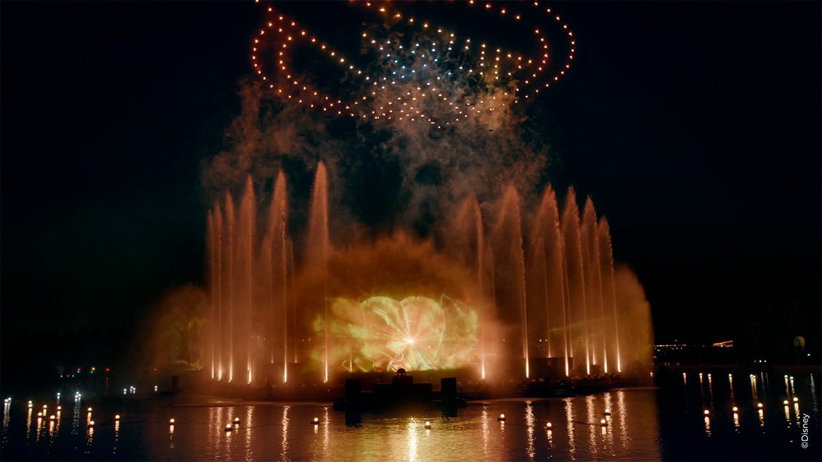The aquatic drones are the breakthrough. They move just above the water and create reflections, lines, shapes, and low-altitude light effects that feel intimate and unusual. Disney says the water acts like a mirror and multiplies the light sources.