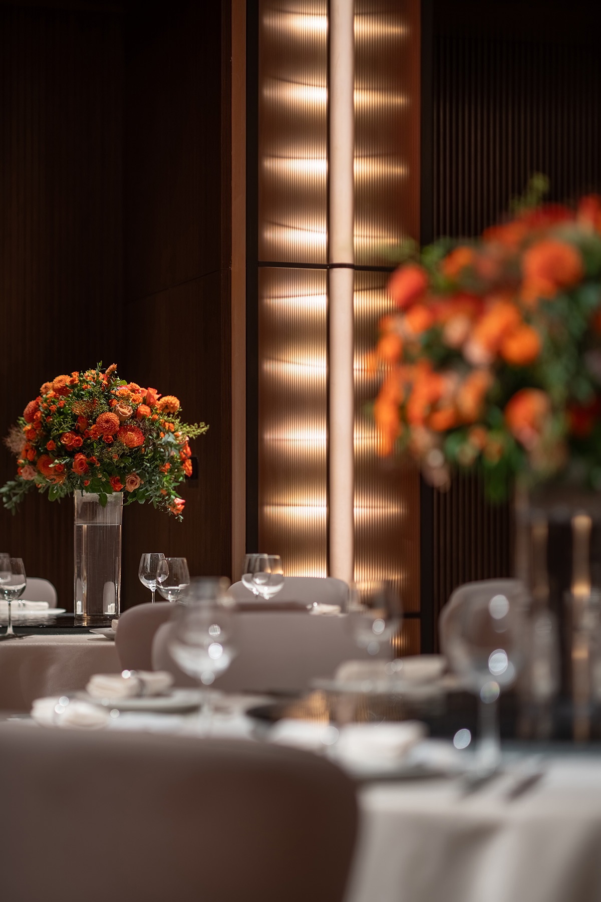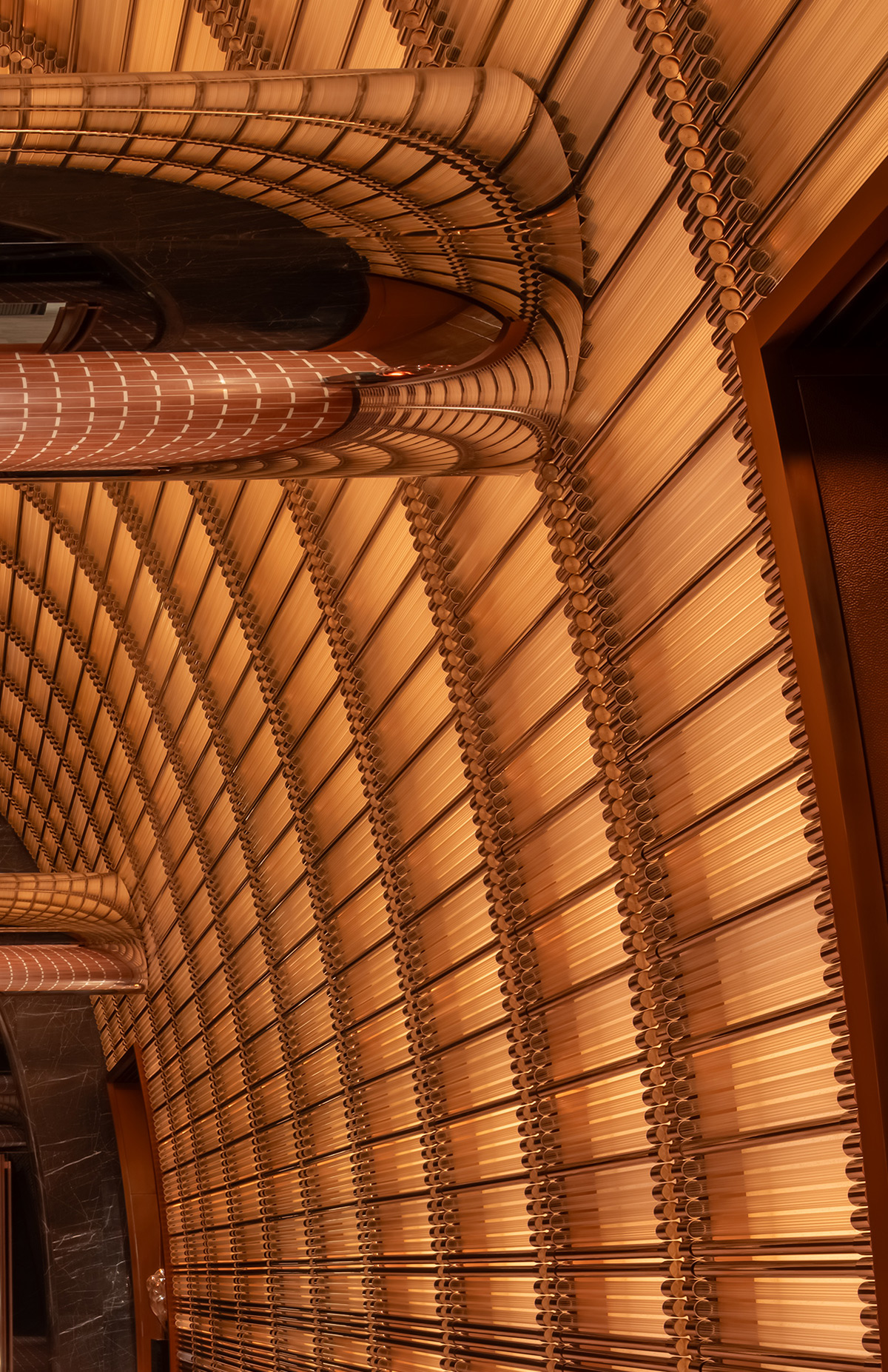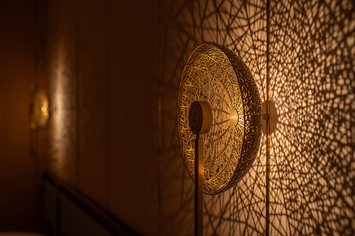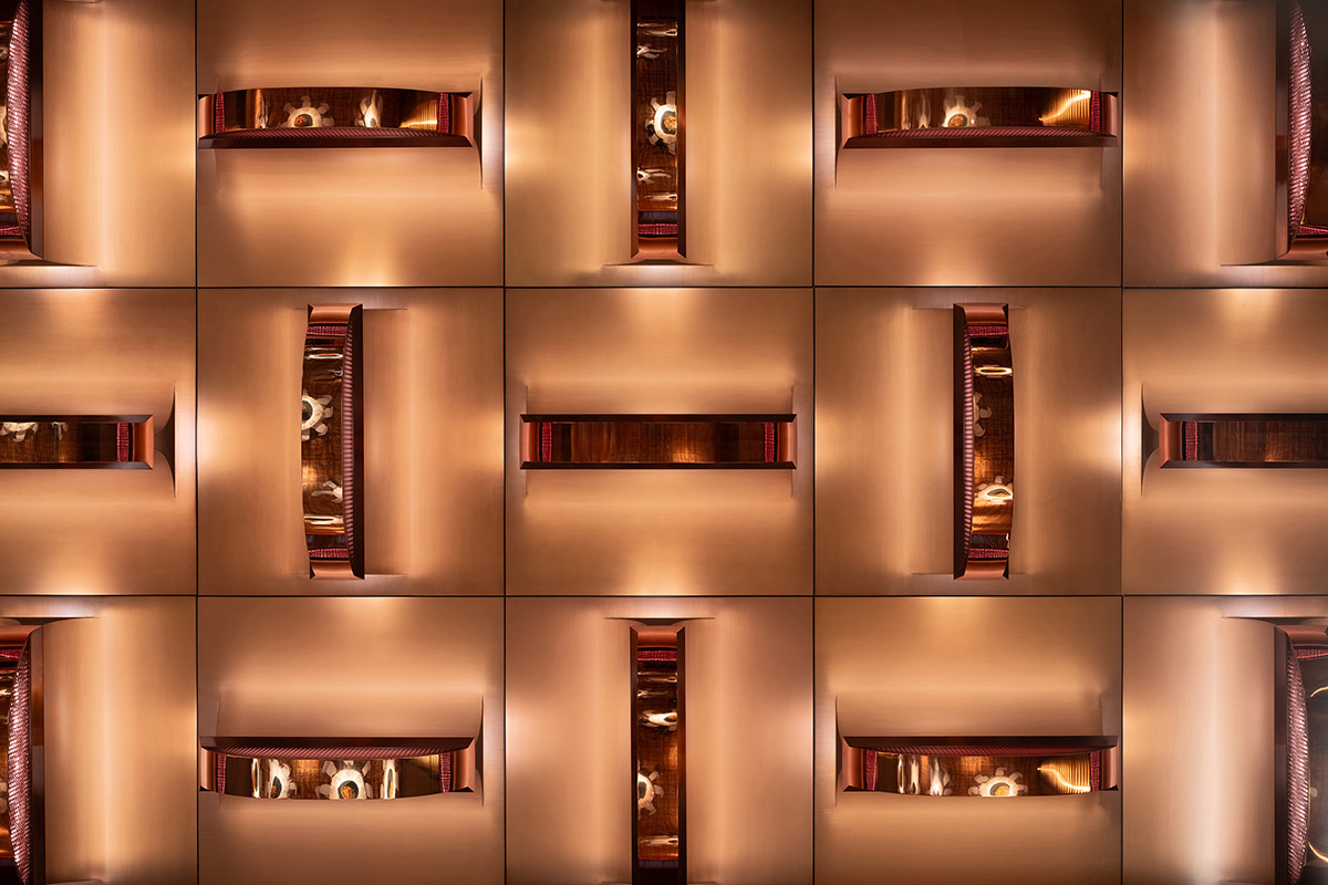 In the adjacent lounge, the ceiling drops lower to make the space feel more human in scale. Monumental copper floor lamps rise between the back-to-back banquettes. Their shades delicately evoke old local lanterns. This arrangement introduces a softer, more intimate, and more domestic light.