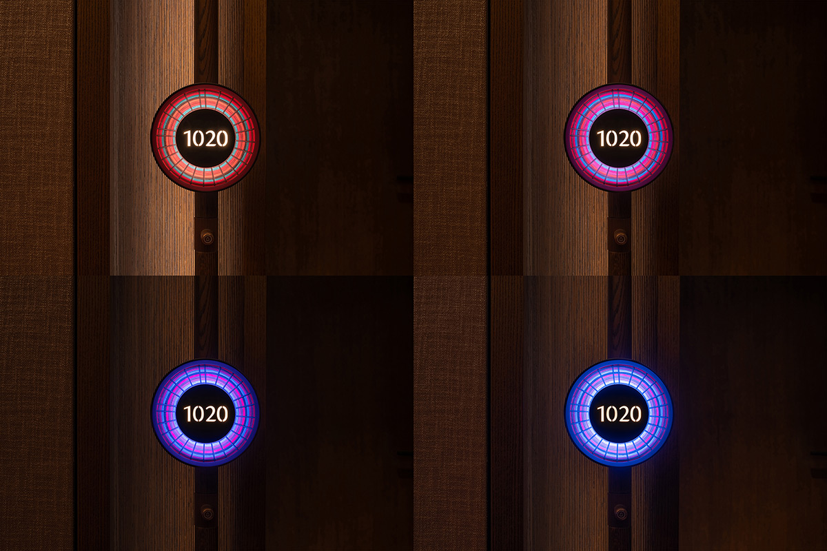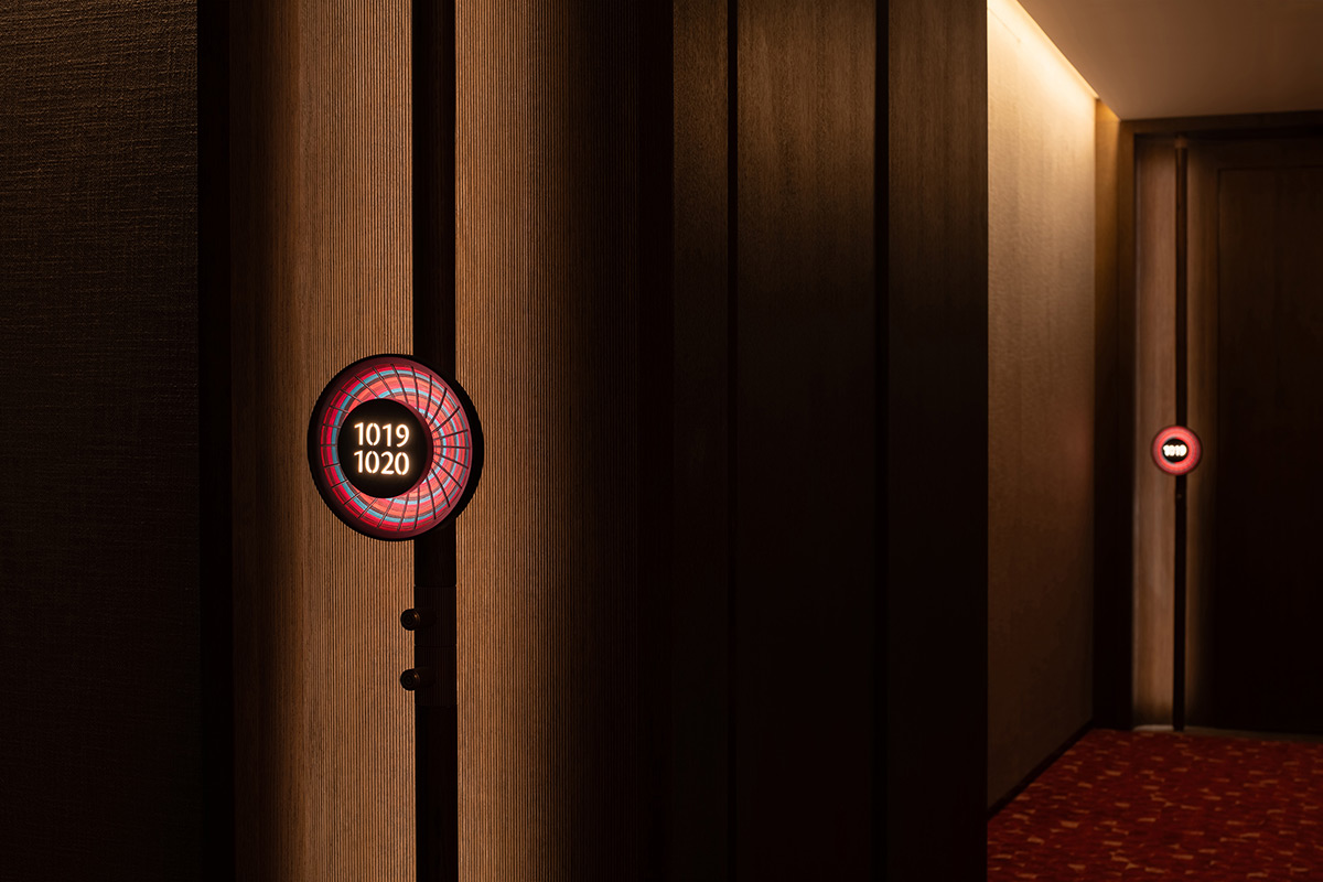 The room entrances offer a welcome change of scale. Here, the light becomes more delicate and intimate. The project reserves color for this single moment in the guest’s journey through the hotel. Woven bamboo reflectors mark each room threshold. They were made with individually dyed fibers. Their concentric pattern evokes Yunnan’s four-season floral landscape.