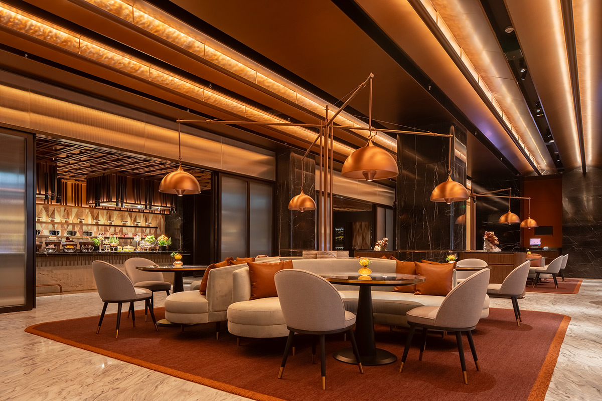The reception area of the Grand Hyatt Kunming lighting design extends the narrative with a more intimate atmosphere. Guests first pass through a lowered, deliberately dim corridor. This transition heightens the sense of arrival and prepares them to discover the central space. The reception then opens up as a dramatic double-height volume. Its identity is defined by a sinuous copper ceiling, illuminated by continuous, precise uplighting.
