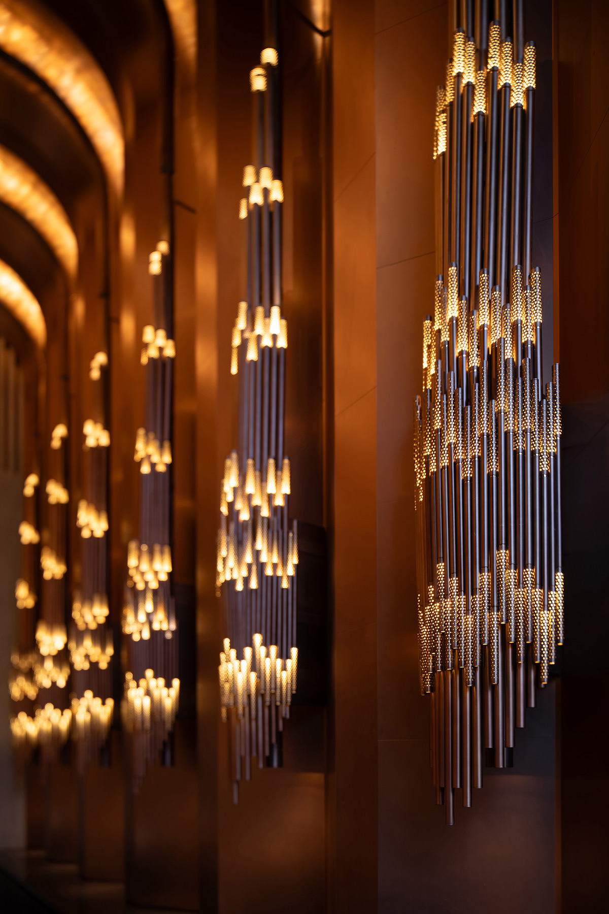 Six large copper wall sconces define the backdrop of the reception desks. Custom-designed for the hotel, they give the counter a monumental and elegant presence.