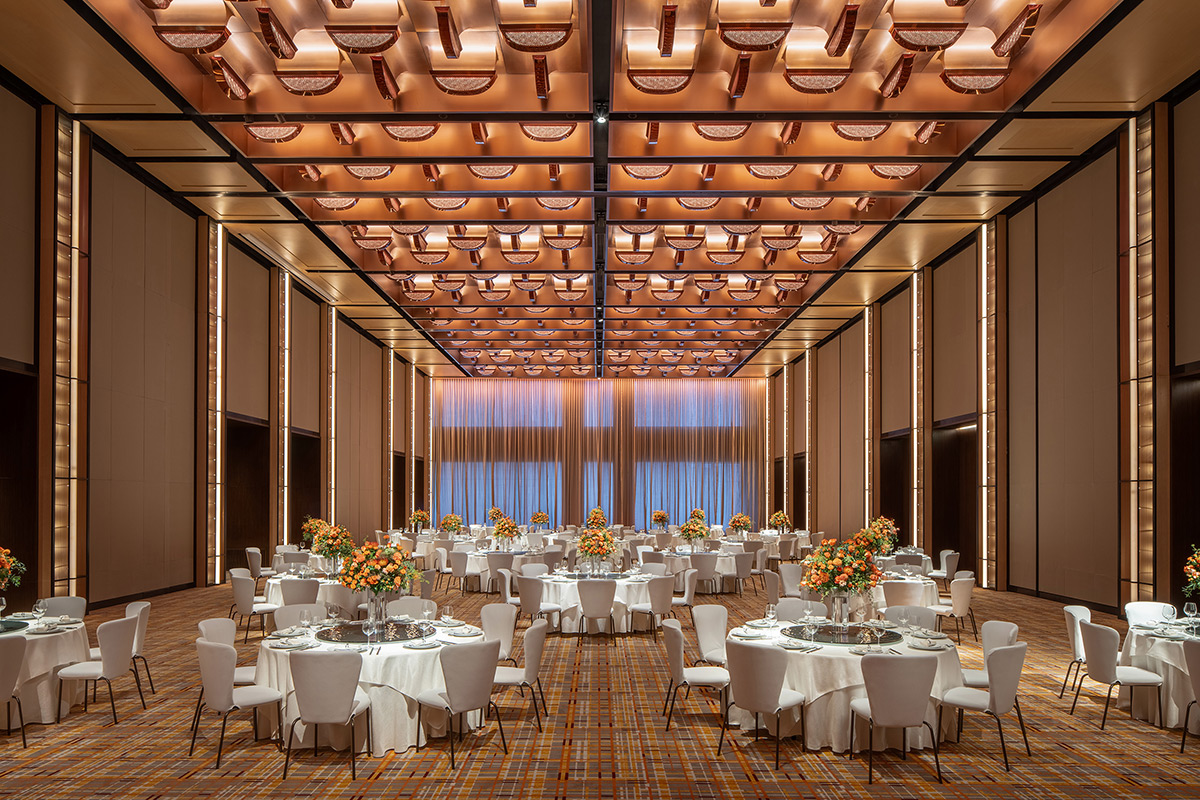 The Grand Hyatt Kunming ballroom adopts a more theatrical lighting scheme. The project celebrates the perilous art of honey harvesting, a traditional practice once carried out on steep cliffs. The lighting designers chose to convey that daring through shadow.