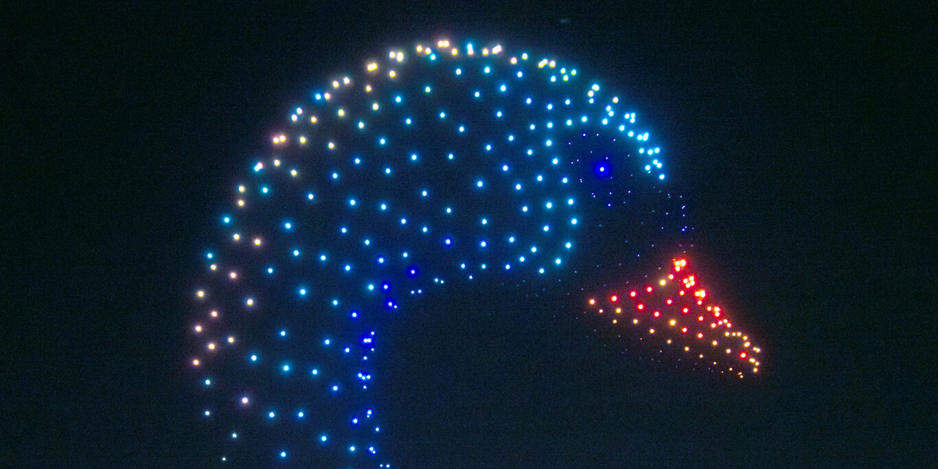 - Côté 3D, le drone show fait appel à une scénographie remarquable : jeux d’échelles, petits oiseaux ou visage monumental, apparition et disparition, etc.