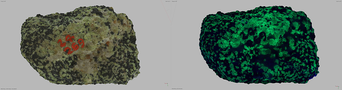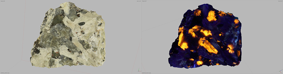 À l’entrée, des minéraux fluorescents issus des collections du Muséum apparaissent sous une lumière blanche puis ultraviolette UV, révélant leurs couleurs cachées grâce à 14 hologrammes 3D de calcite, sodalite ou aragonite.
