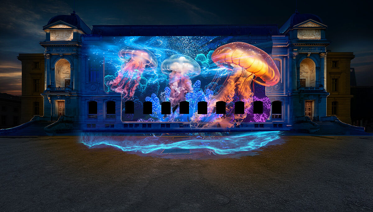 La façade de la Grande Galerie de l’Évolution de 40 m de long s’illumine d’un film d’animation. Il plonge le spectateur dans un océan phosphorescent. 70% des organismes marins des grands fonds usent de la bioluminescence pour survivre. Elle leur permet de se défendre, désorienter les prédateurs, attirer des proies ou un partenaire, et communiquer.