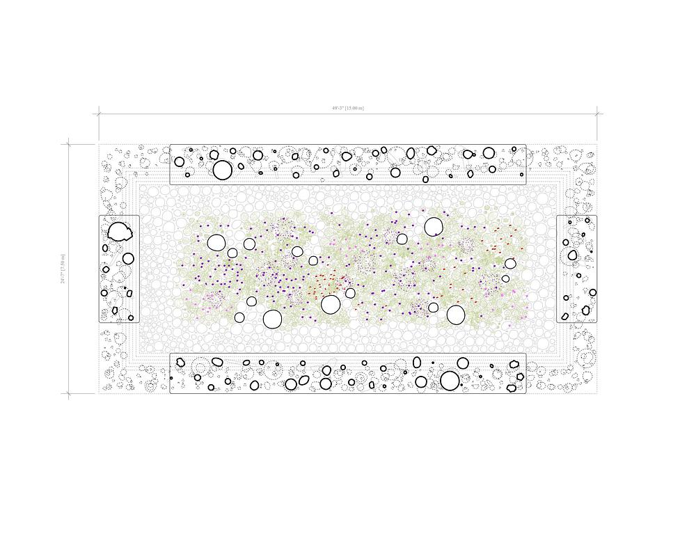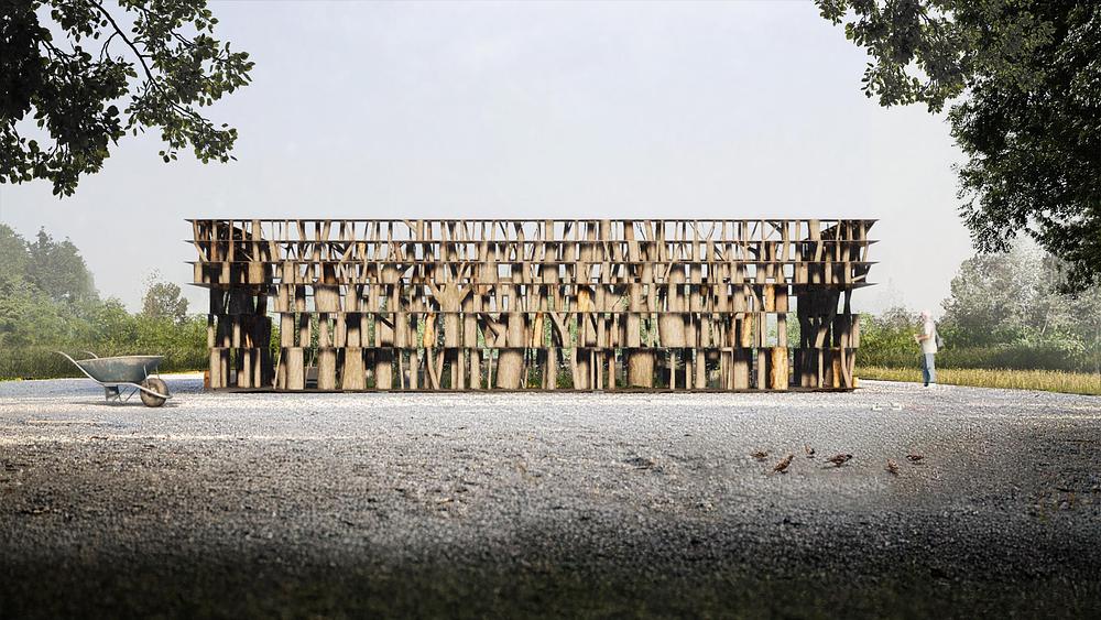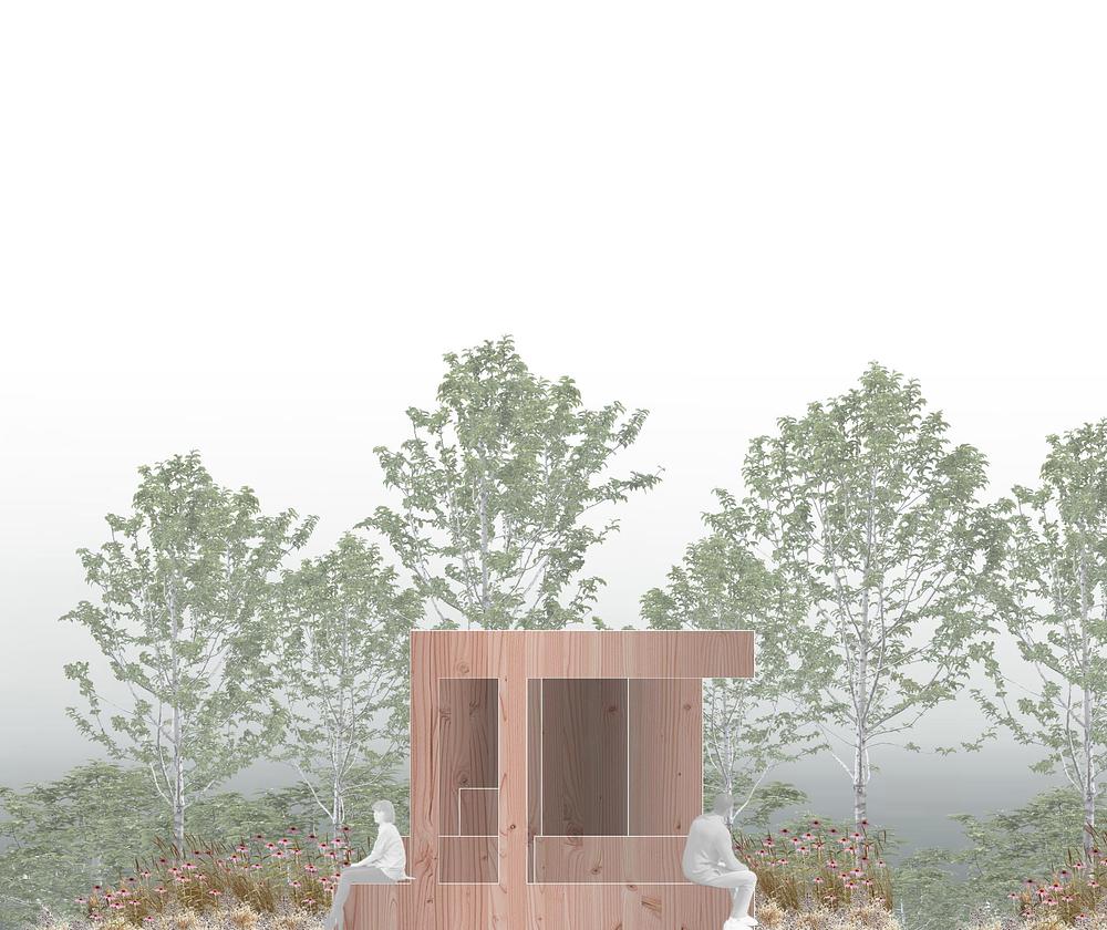 Dans un écrin de verdure, Again, a Garden s'impose comme un jardin clos, où un pavillon de rondins et de plaques métalliques célèbre les espèces pollinisatrices indigènes.