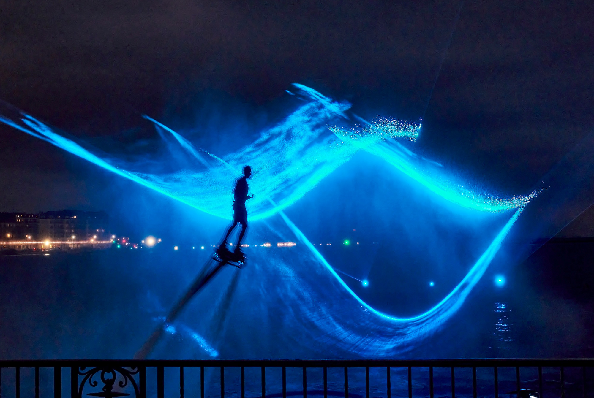 Photo en tête de l’article : Festival lumière Suisse – Ballet Nocturne sur l-eau, Geneva Lux 2025, Jardin Anglais, Genève – Flyboard Jeff Gazzola – Performance laser SBK Laser – Photo © Rémy Gindroz
