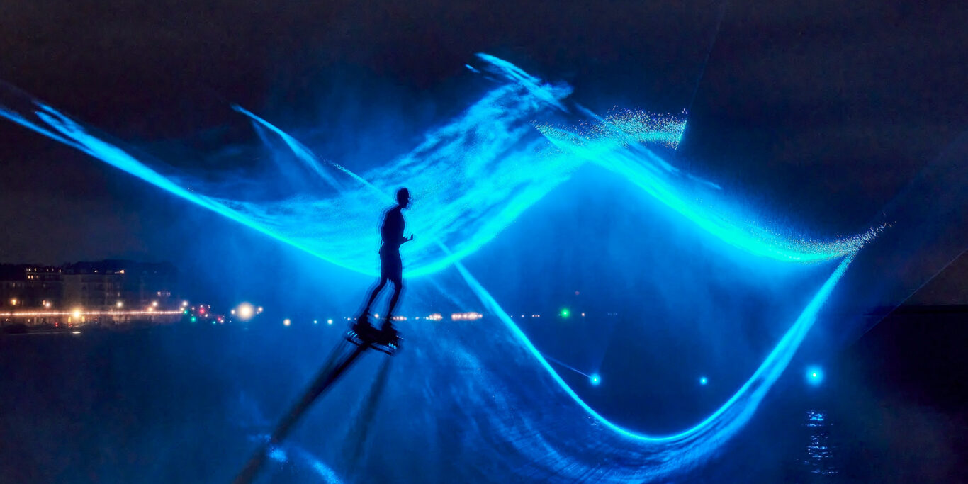 Photo en tête de l’article : Festival lumière Suisse – Ballet Nocturne sur l-eau, Geneva Lux 2025, Jardin Anglais, Genève – Flyboard Jeff Gazzola – Performance laser SBK Laser – Photo © Rémy Gindroz