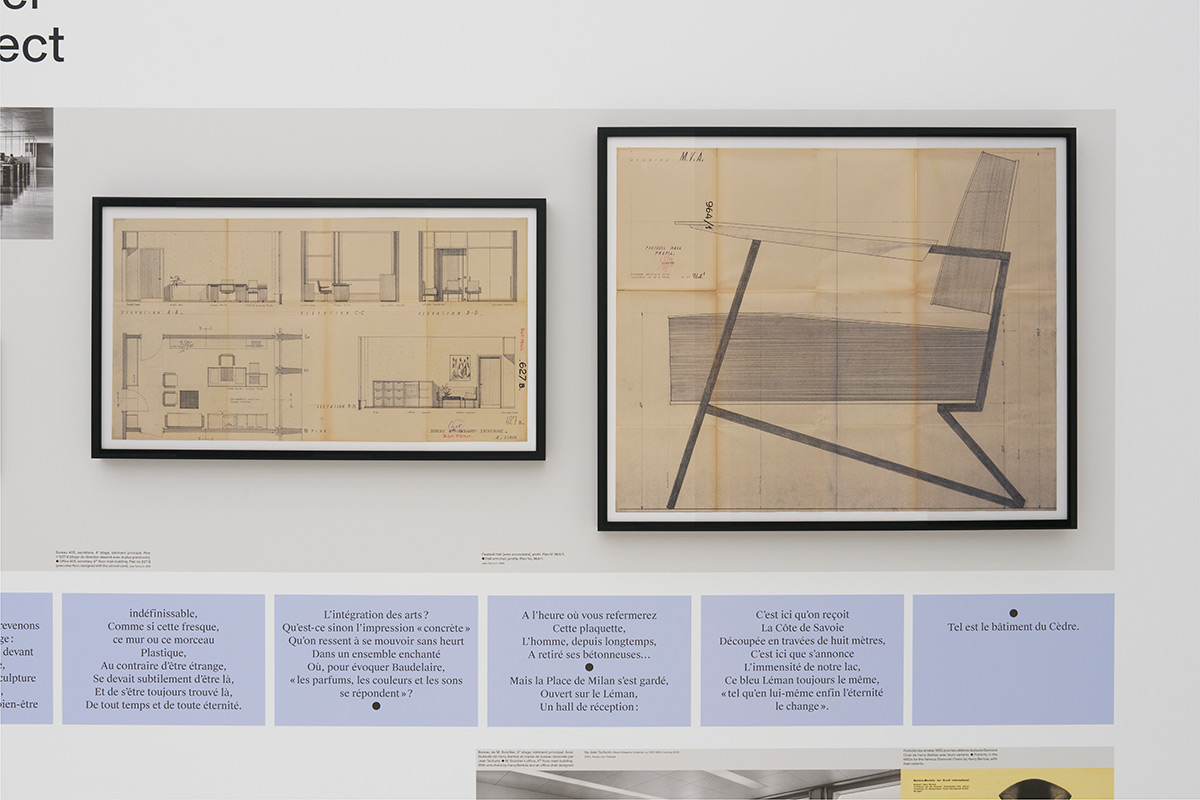 L’exposition est centrée sur ses créations emblématiques de mobilier pour Le Cèdre, le siège de la Vaudoise Assurances.