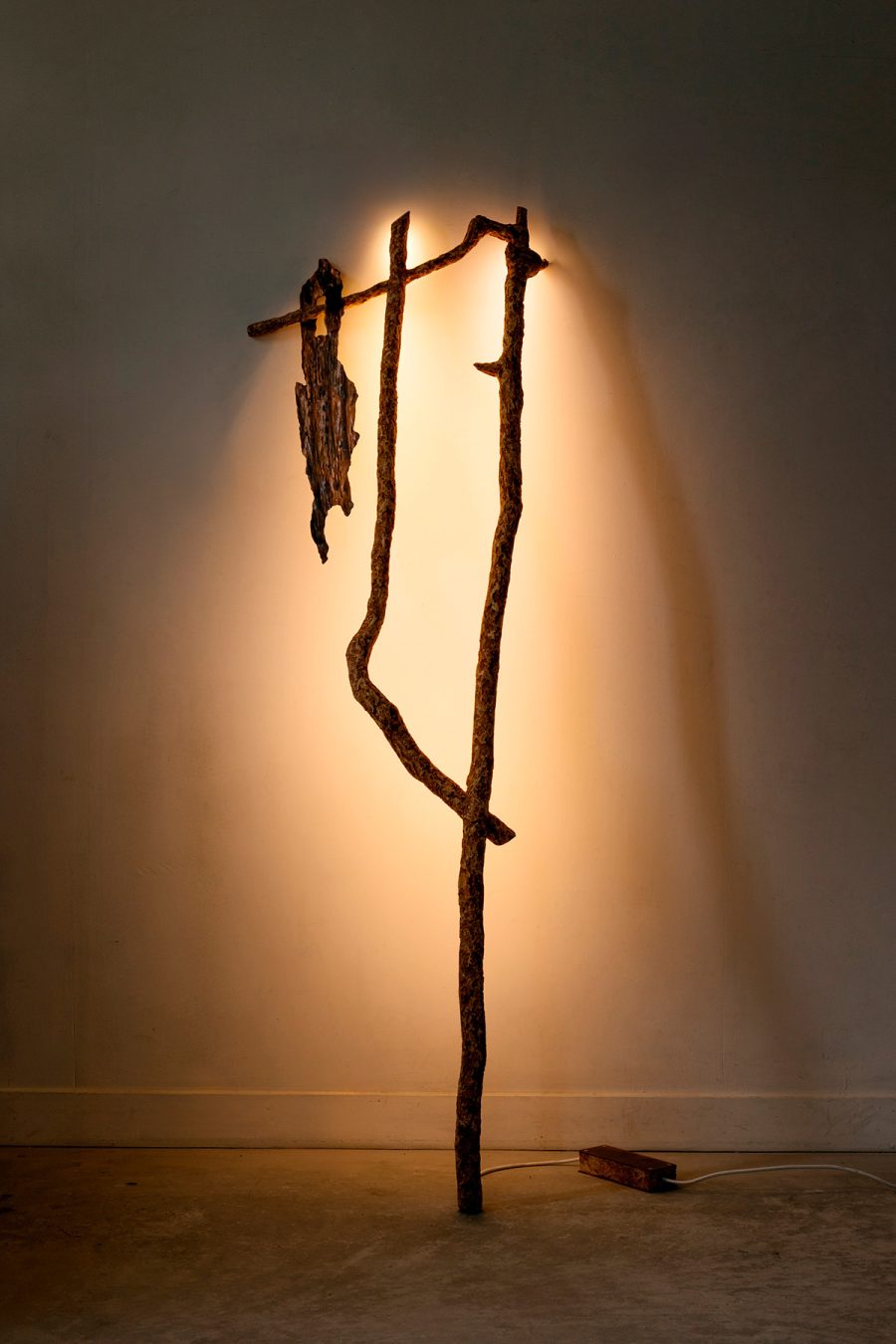 Chez l’artisan d’art Maxime Bellaunay, la lumière n’est jamais un simple ajout. Elle devient une matière à part entière. Incrustés avec finesse dans les branches, des rubans LED diffusent selon les œuvres une lumière chaude ou froide, presque vibrante, qui semble respirer avec le bois. Cette clarté indirecte se projette sur le mur d’appui et enveloppe la sculpture d’un halo subtil. Comme si l’objet se détachait doucement du réel pour entrer dans un espace suspendu. Le regard est alors guidé vers les reliefs, les patines métalliques, les aspérités du bois et les matières minérales. Tout se joue dans l’équilibre entre ombre et lumière, entre présence physique et apparition poétique. L’ébéniste transforme ainsi la pièce d’art en sculpture à l’expérience sensible. La lumière révèle, caresse et métamorphose le réel.