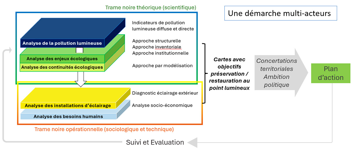 - une approche scientifique, fondée sur l’analyse de la pollution lumineuse (intensité, diffusion, spectre) et l’identification des enjeux écologiques ;