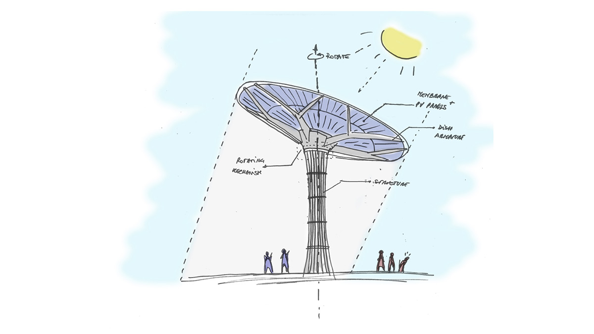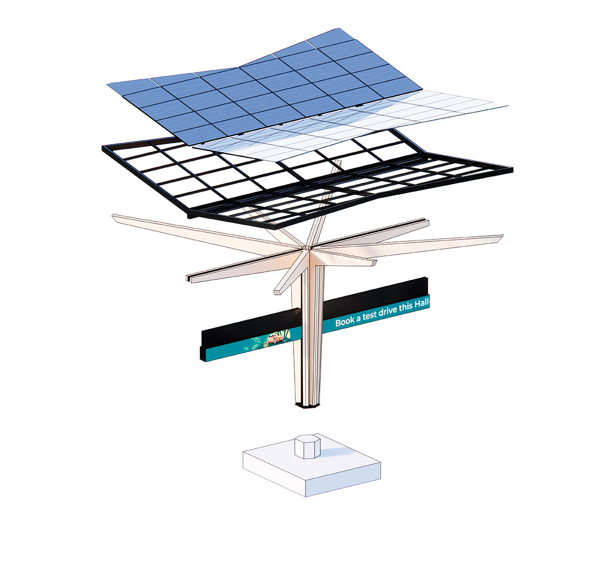 Pour le projet Gigatons, le design est axé sur la source d’énergie. Cette infrastructure de recharge de véhicules électriques prend l’énergie comme impulsion pour la conception. Par conséquent, les panneaux solaires sont complètement intégrés. Ici, ils sont à double face, utilisant la lumière réfléchie par le bas ainsi que par la surface du toit.