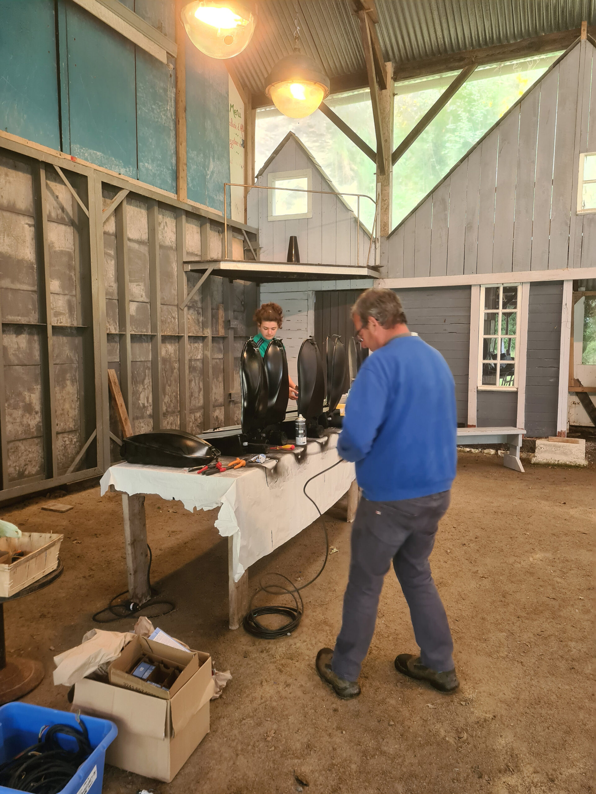 On a fait un atelier de 3 jours, récupéré tout ce qu’on avait et tout amené à Oléron. Dans une super ambiance, on a fabriqué trois pièces très intéressantes. Jocelyn était très partant. Ça a été réellement constructif : en trois jours, trois belles suspensions ont été installées. Ça donne une vraie identité au tiers-lieu.