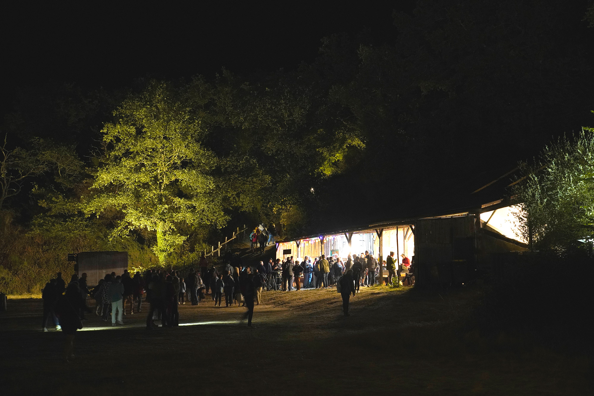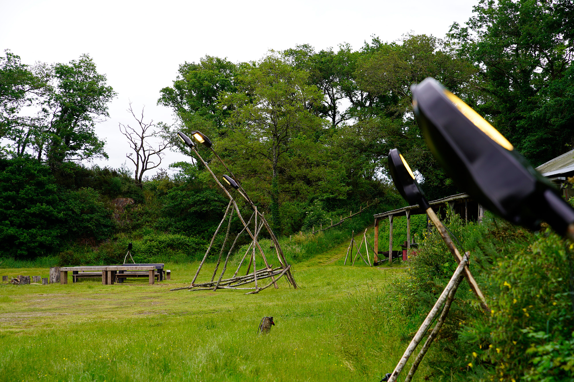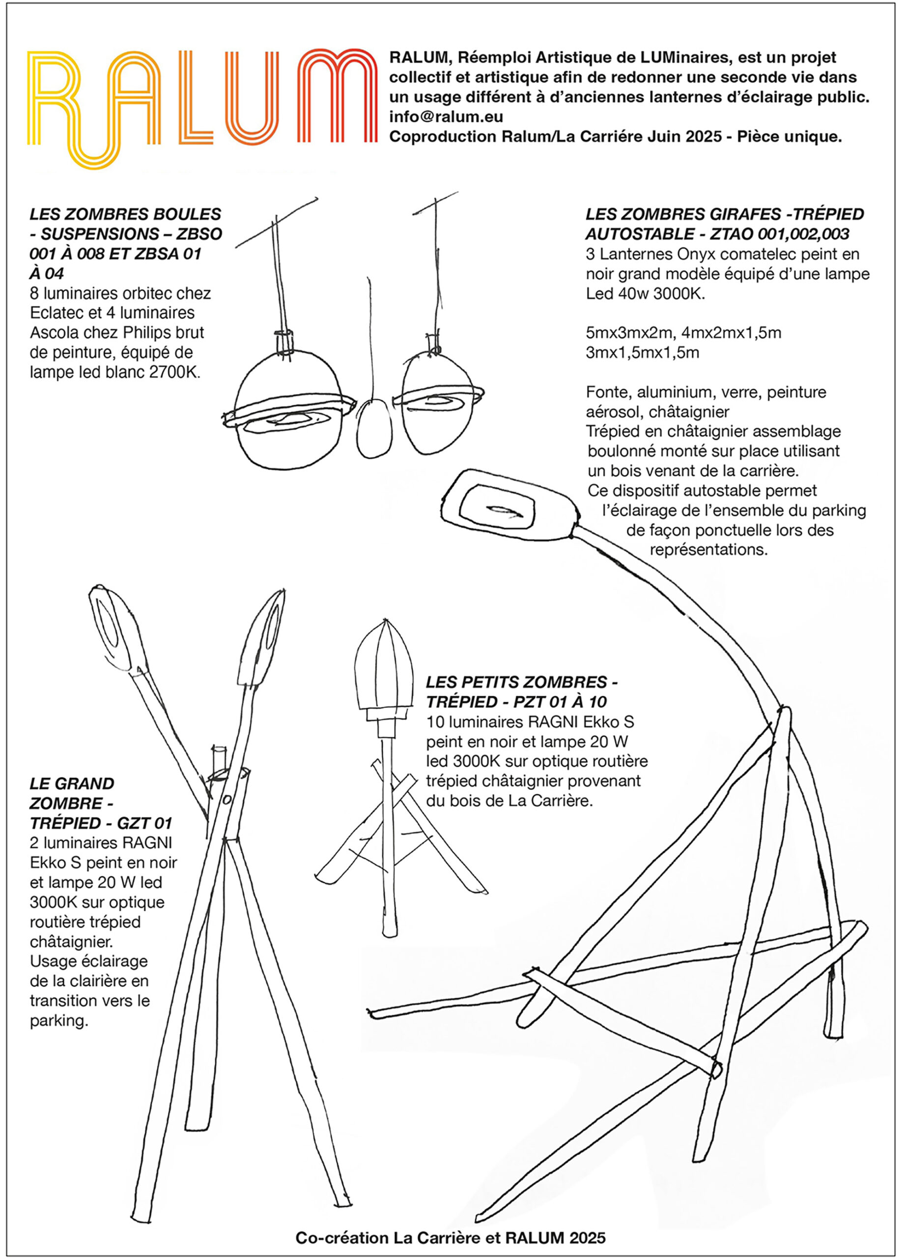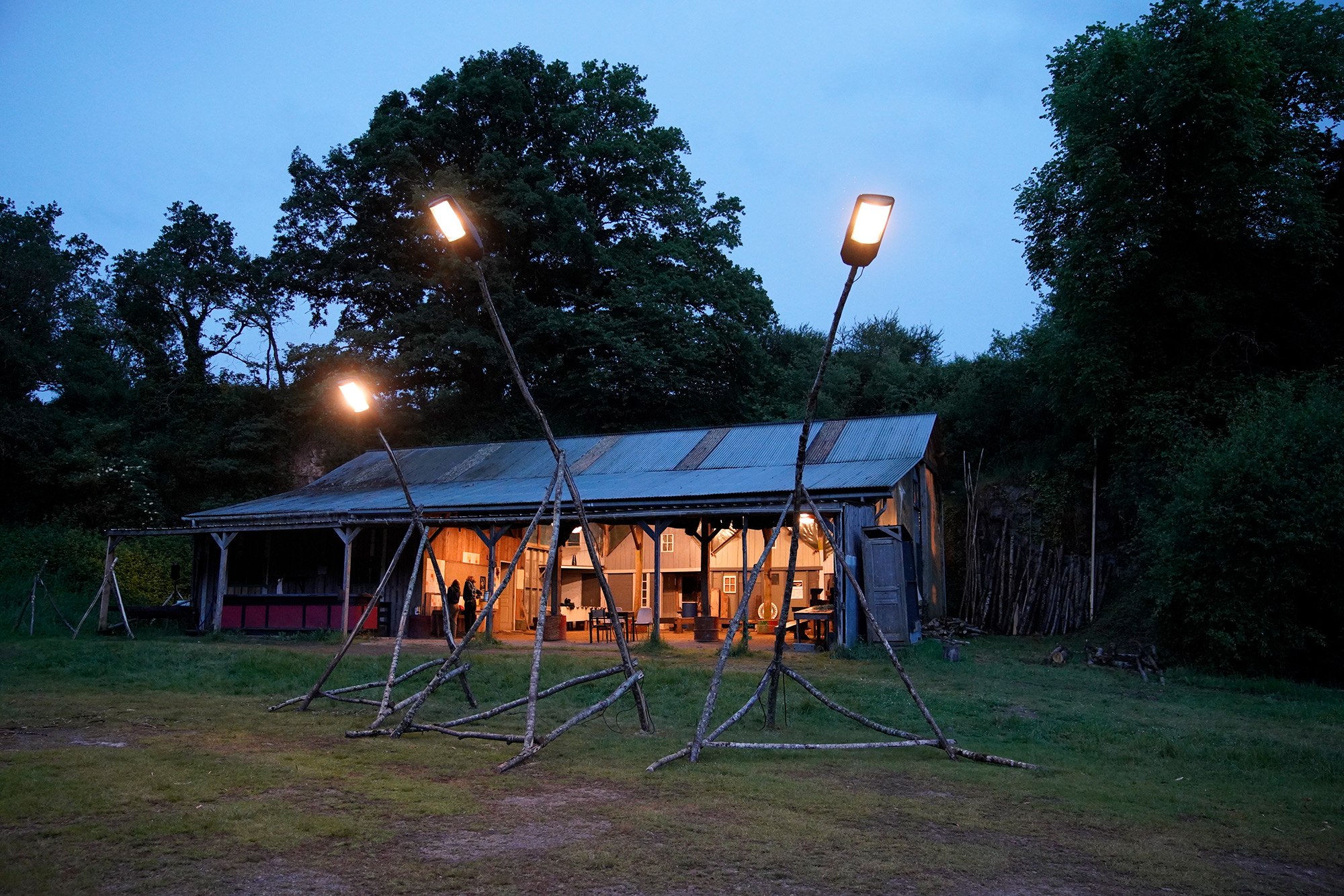 Charles Vicarini : Ils avaient besoin d’accompagner les visiteurs après la représentation, de la scène au parking, jusqu’au bar. On a mis en place ce que l’on appelle des « zombres », des objets et des supports de luminaires en réemploi, avec du bois local, principalement du châtaignier. Les têtes de luminaires apportent la lumière. Ils sont démontables, installés une fois seulement dans l’année. Cela a commencé 4 juillet 2025 et s’est terminé samedi 19 juillet soir, et on démonte dimanche 20 juillet 2025. On va faire un échange ; la carrière nous met à disposition son espace.