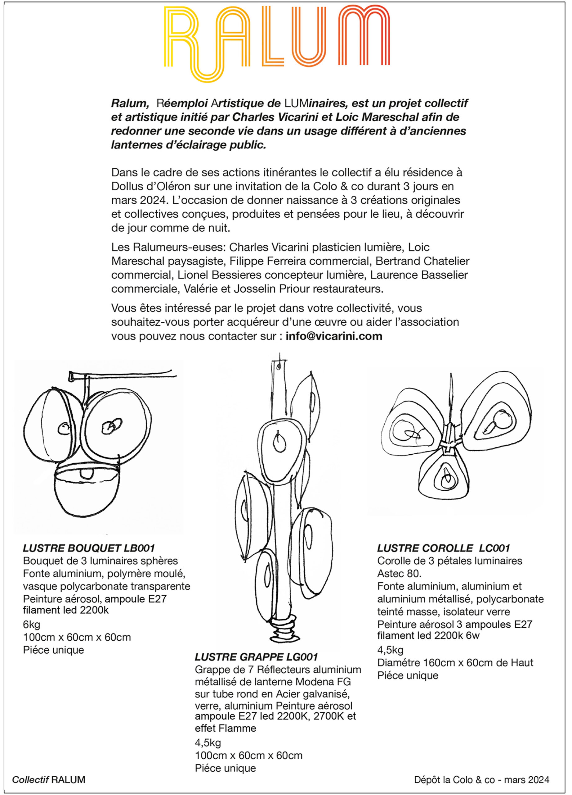 Charles Vicarini : Ralum signifie « réemploi artistique de luminaires ». Notre association s’est créée afin de réemployer les anciens luminaires d’éclairage public remplacés lors du passage au numérique. Aujourd’hui, ces objets industriels sont souvent broyés ou recyclés, mais rarement réutilisés, alors qu’ils ont un potentiel de réemploi en tant que biens communs pour un usage collectif.