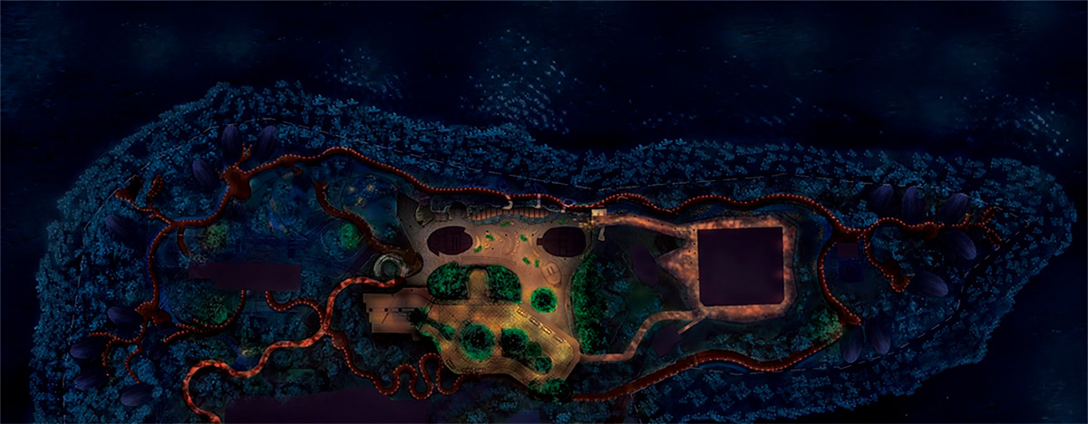 J’ai ainsi élaboré une stratégie lumineuse en « descrescendo », douce et enveloppante, visant à désamorcer la peur du noir. L’idée n’était pas de compenser l’obscurité, mais au contraire de l’apprivoiser, en orchestrant les contrastes et les seuils d’éclairage pour reconnecter le public à une expérience plus naturelle de la nuit.