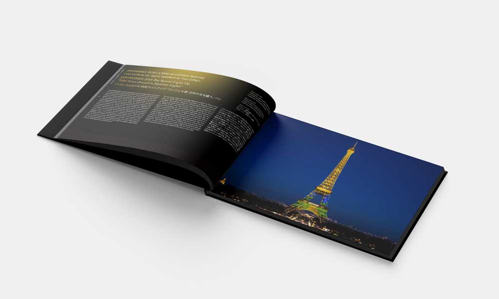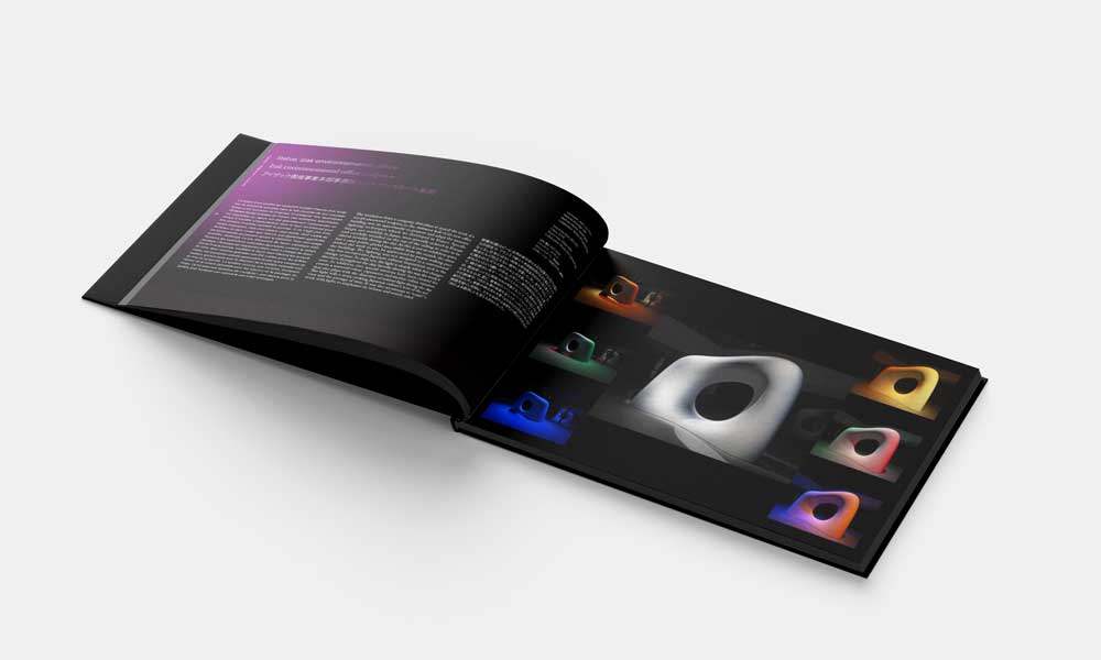 Au format paysage 16/9 un peu allongé, la mise en page s’organise sous forme de planches. À gauche, le texte. À droite, les photographies. Parfois, deux pages d’images augmentent l’immersion dans les réalisations. Imprimé sur un papier mat avec un fond noir uni, le design graphique conçu par Akari-Lisa Ishii est atypique. Sous forme d’un halo de lumière, il reprend l’une des teintes dominantes des photos sur l’autre page. Comme un effet de lumière diffuse, très japonais, créant une gradation lumineuse apaisante sur chaque page. Effet subtil de nuance et de douceur…