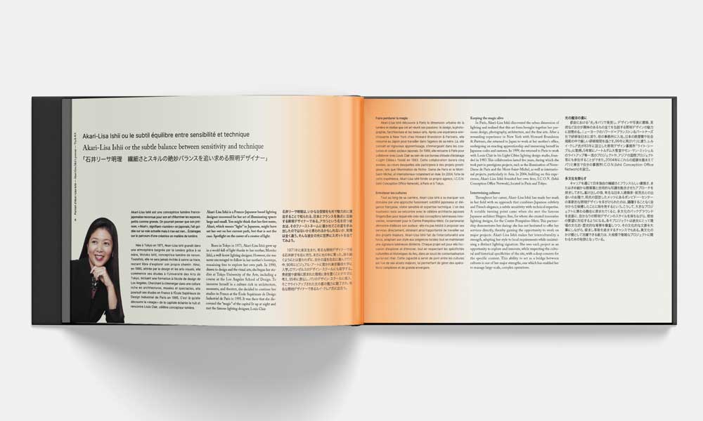 Interviewée par la journaliste Laurie Picout, l’ouvrage commence par une introduction en forme de biographie de la conceptrice lumière. Entre les chapitres de références contextualisées de l’agence, deux entretiens avec Akari-Lisa Ishii ponctuent également le livre.