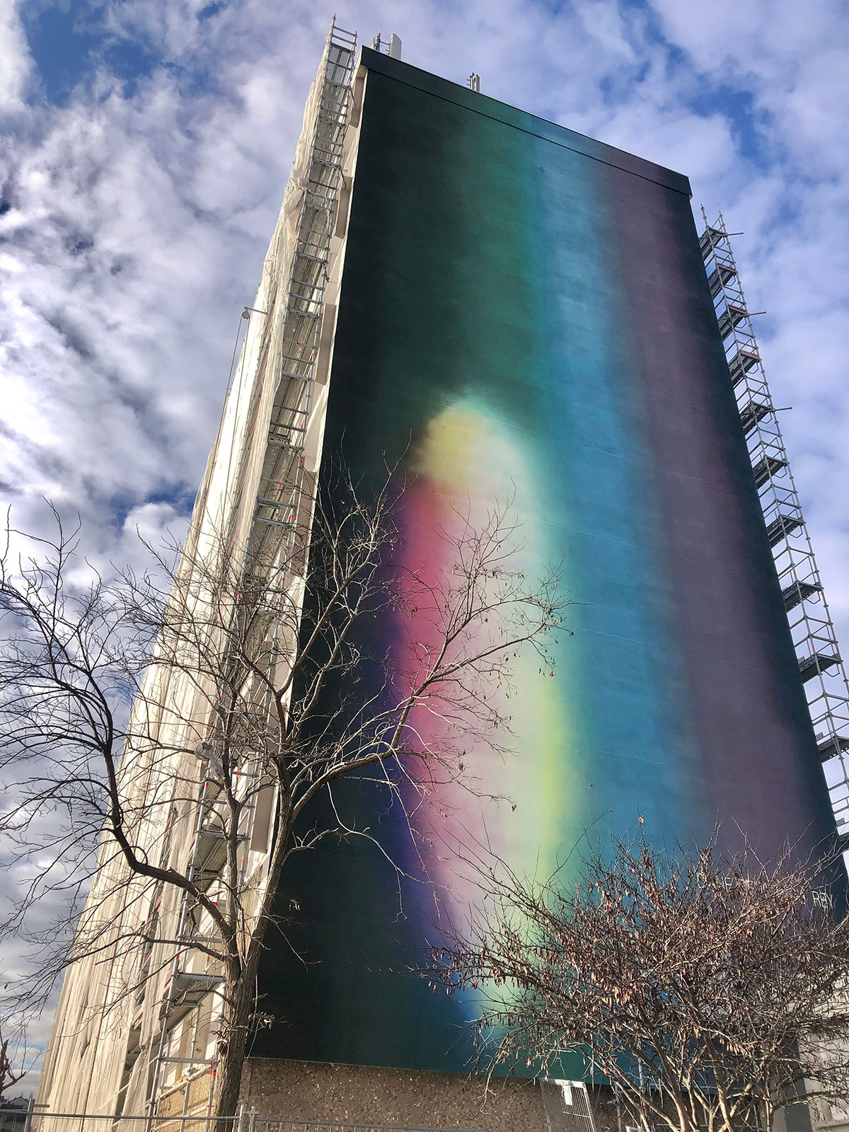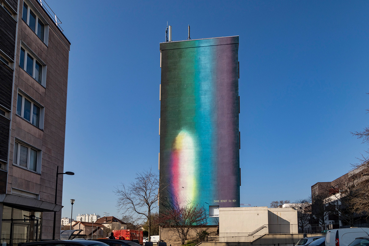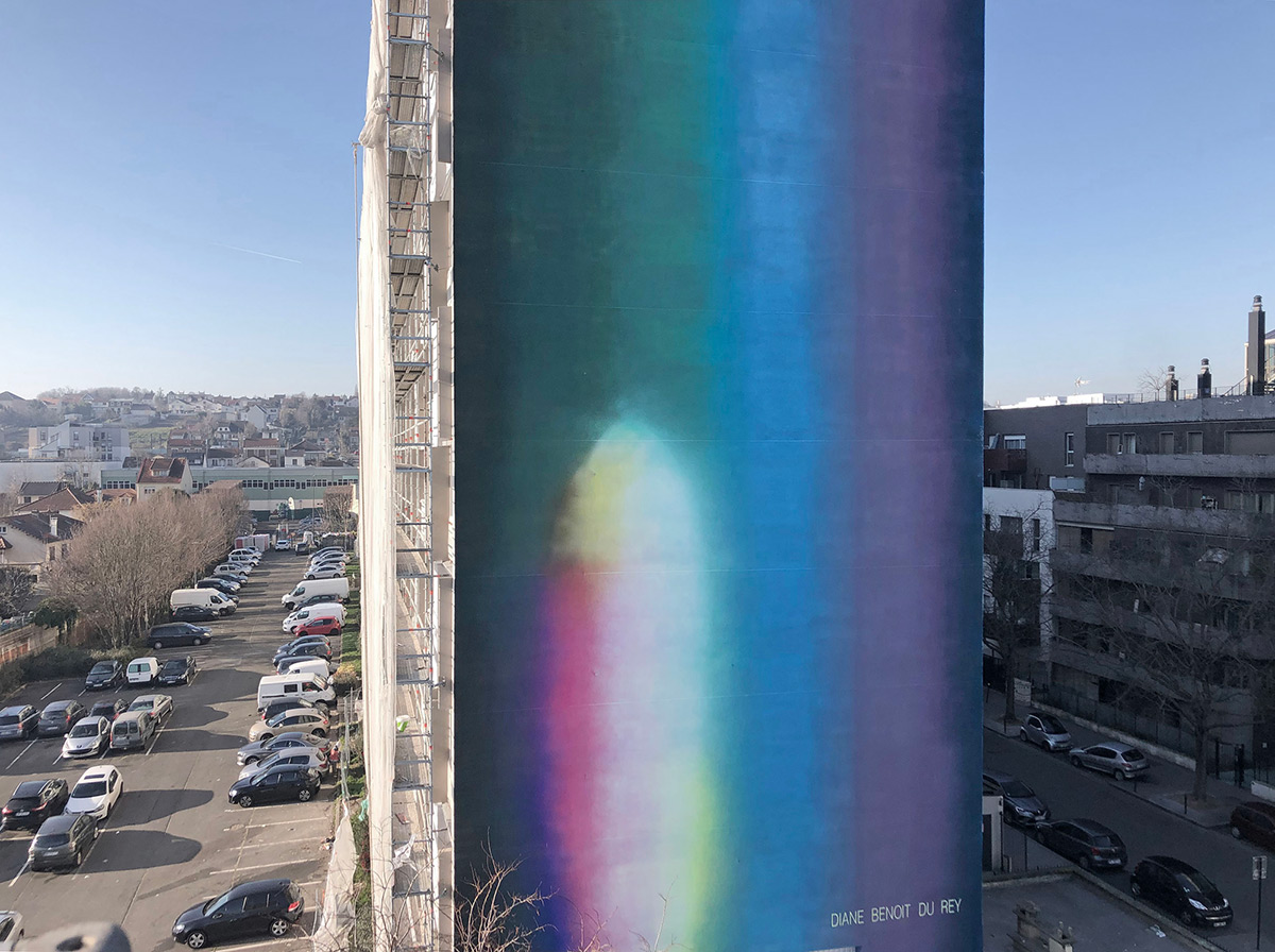 Architecture en lumière, c’est le nouveau cœur du quartier Balzac Touraine-Marronniers de la ville de Vitry-sur-Seine. Une fresque murale monumentale de la jeune artiste peintre Diane Benoit du Rey. Elle recouvre depuis un an l’immeuble de 9 étages sur 30 mètres de haut et 11 mètres de large. 13 étages d’échafaudage et 160 litres de peinture acrylique recouvre les 330 m2 de matière lumière.