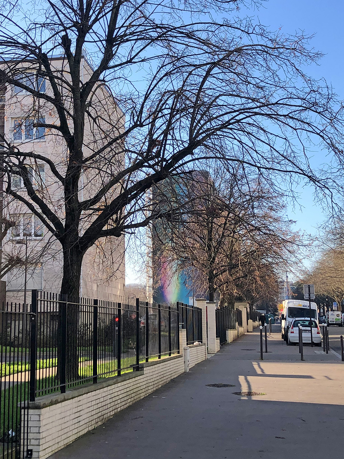 « L’image que je propose pour la fresque est pensée de manière à faire dialoguer la peinture avec son environnement proche, en s’inspirant à la fois de lumières urbaines (lampadaire, phare de voiture, etc) et de halos lumineux naturels.