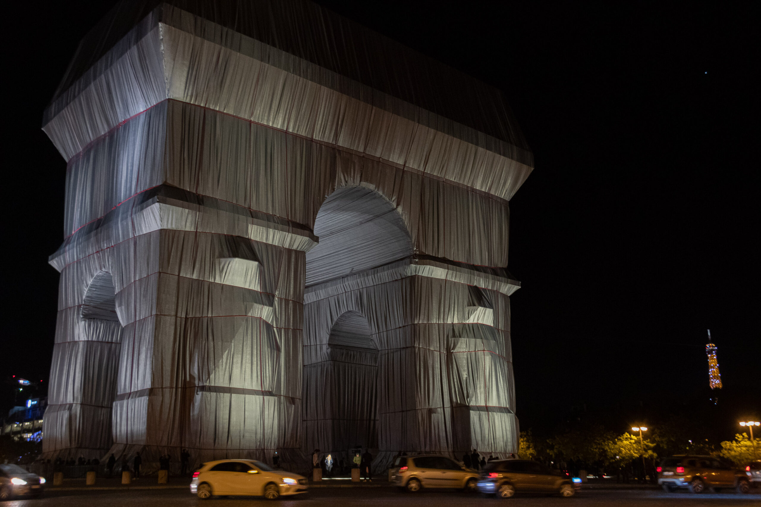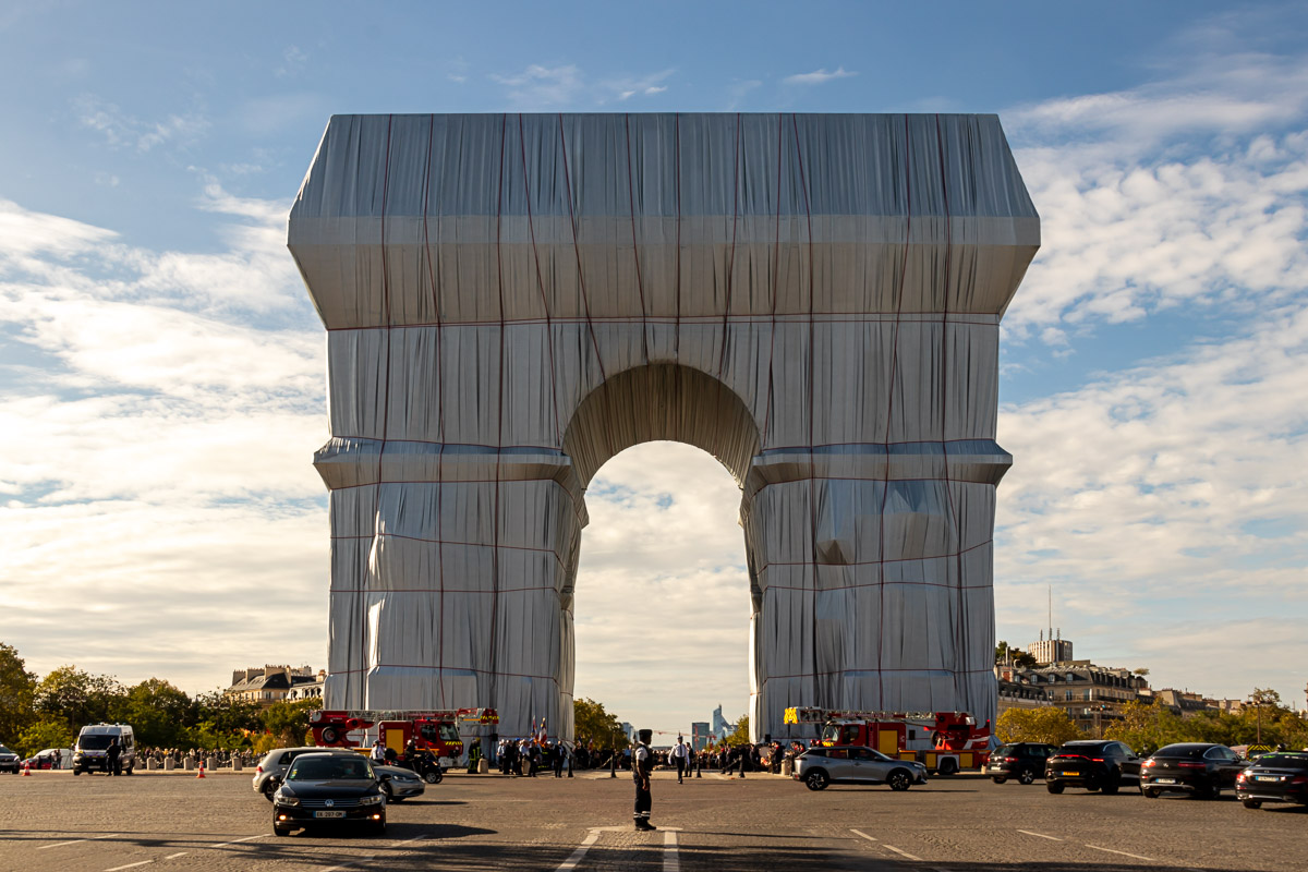 Encore une fois, le duo d’artistes contemporains Christo et Jeanne-Claude a réalisé une œuvre contemporaine hors norme. Pleine de poésie et tout en sobriété, elle habille le monument emblématique au bout de l’avenue des Champs Élysées. Cette création contemporaine interroge notre rapport au patrimoine, à son échelle, et le sens de la vie en ville.