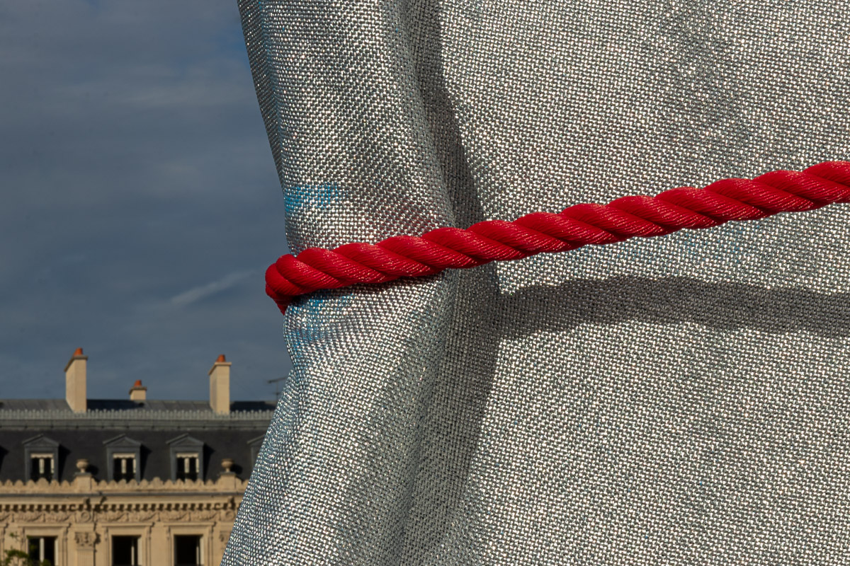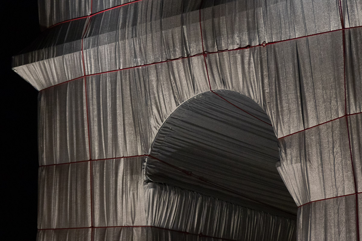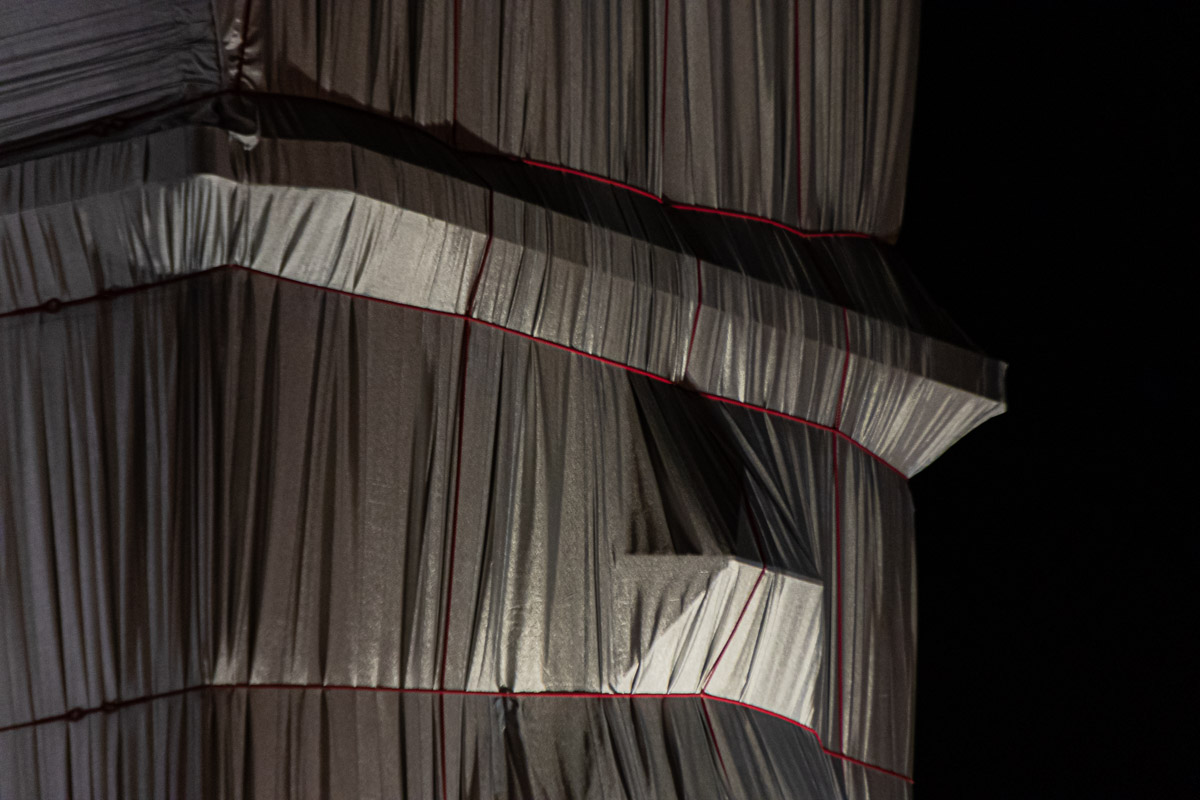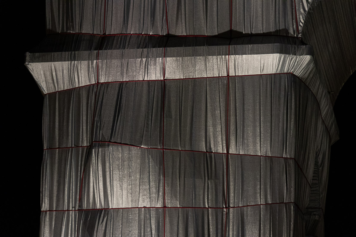 Le matériau argenté prend la lumière du jour de manière remarquable. Il créé des jeux de brillance et de reflets selon le point de vue sur l’Arc de Triomphe. Enfin, il accentue le volume du drapé sur le monument avec la direction des rayons de soleil, comme ici en fin de journée.