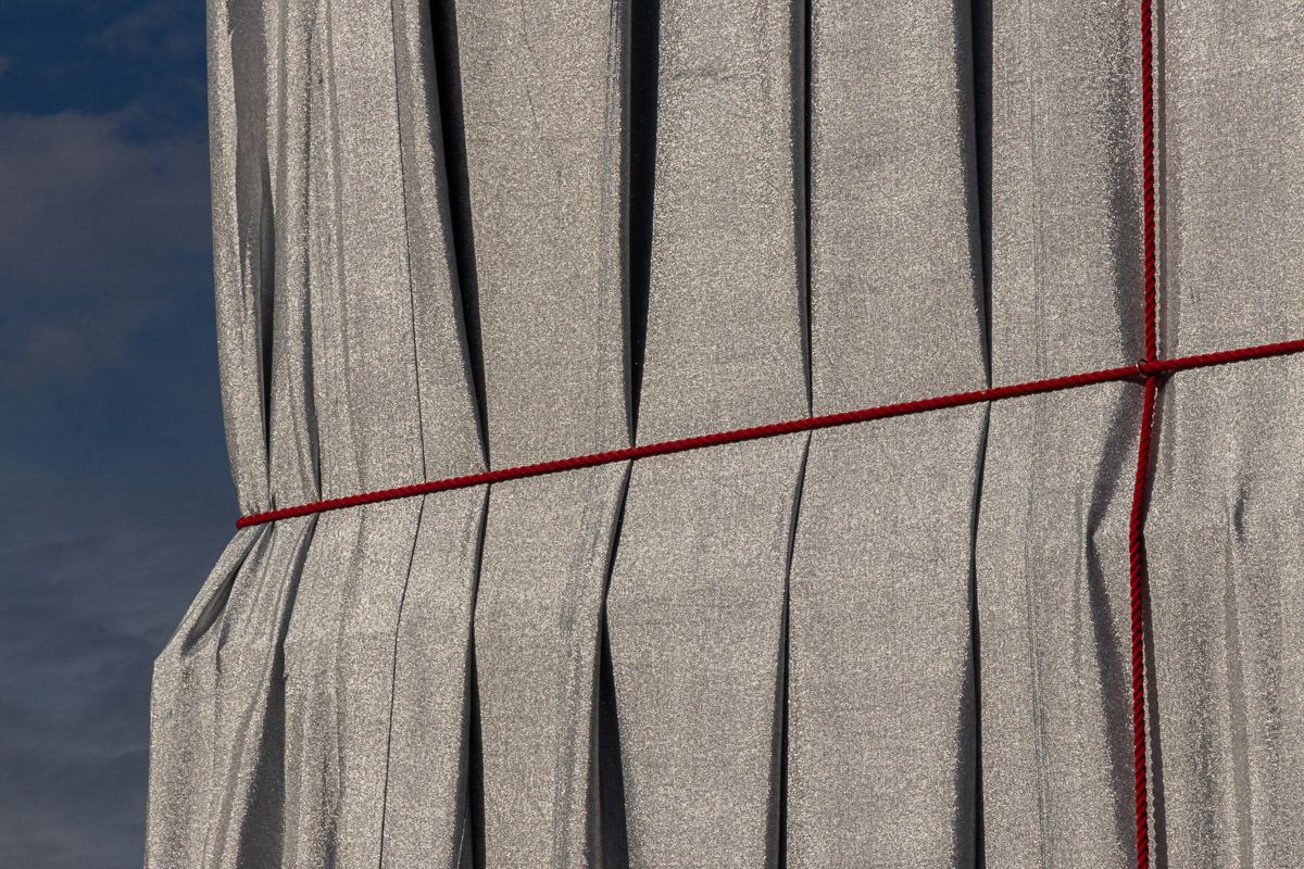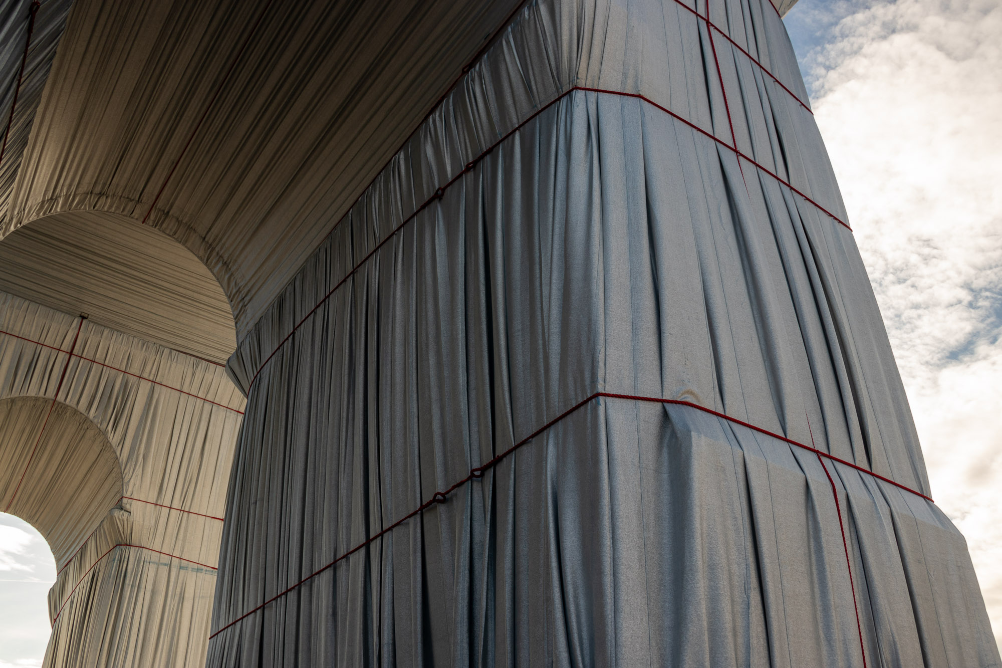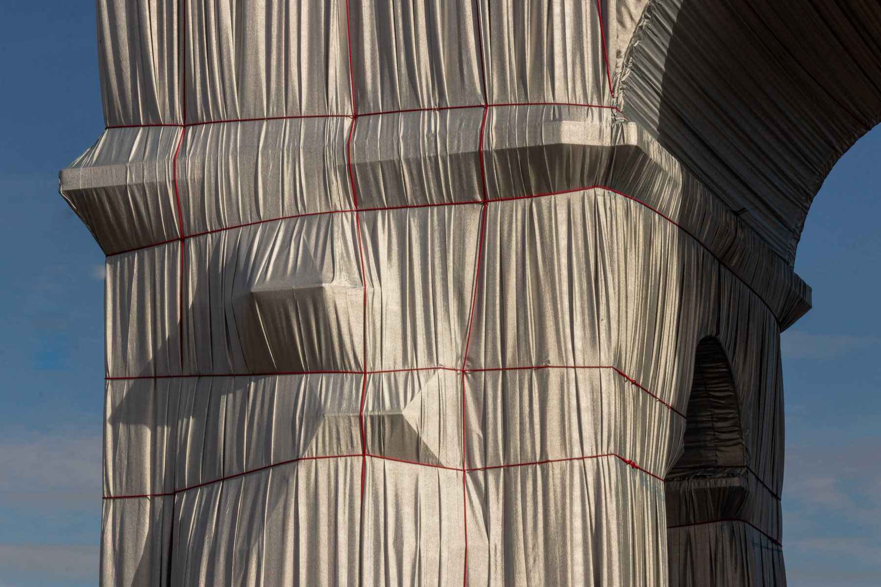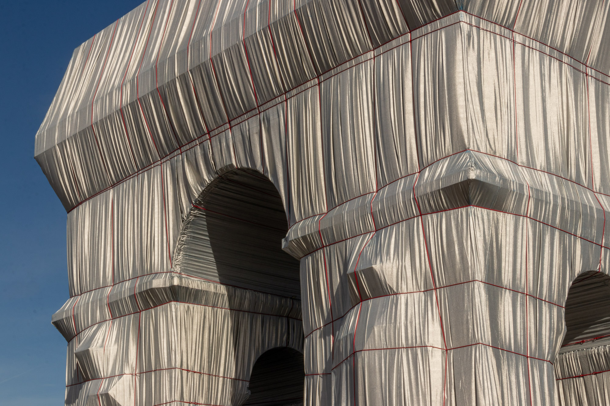 Le matériau argenté prend la lumière du jour de manière remarquable. Il créé des jeux de brillance et de reflets selon le point de vue sur l’Arc de Triomphe. Enfin, il accentue le volume du drapé sur le monument avec la direction des rayons de soleil, comme ici en fin de journée.