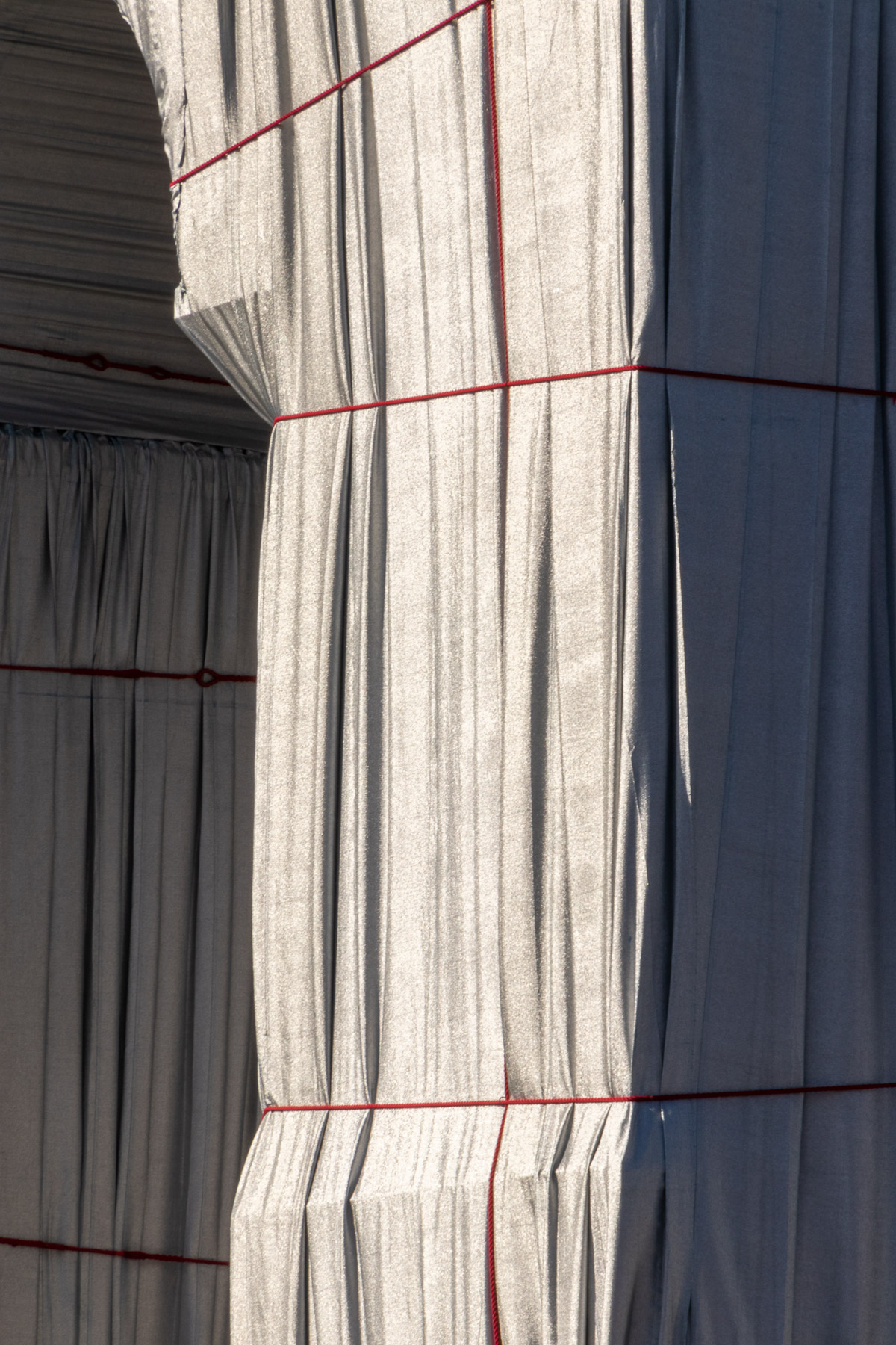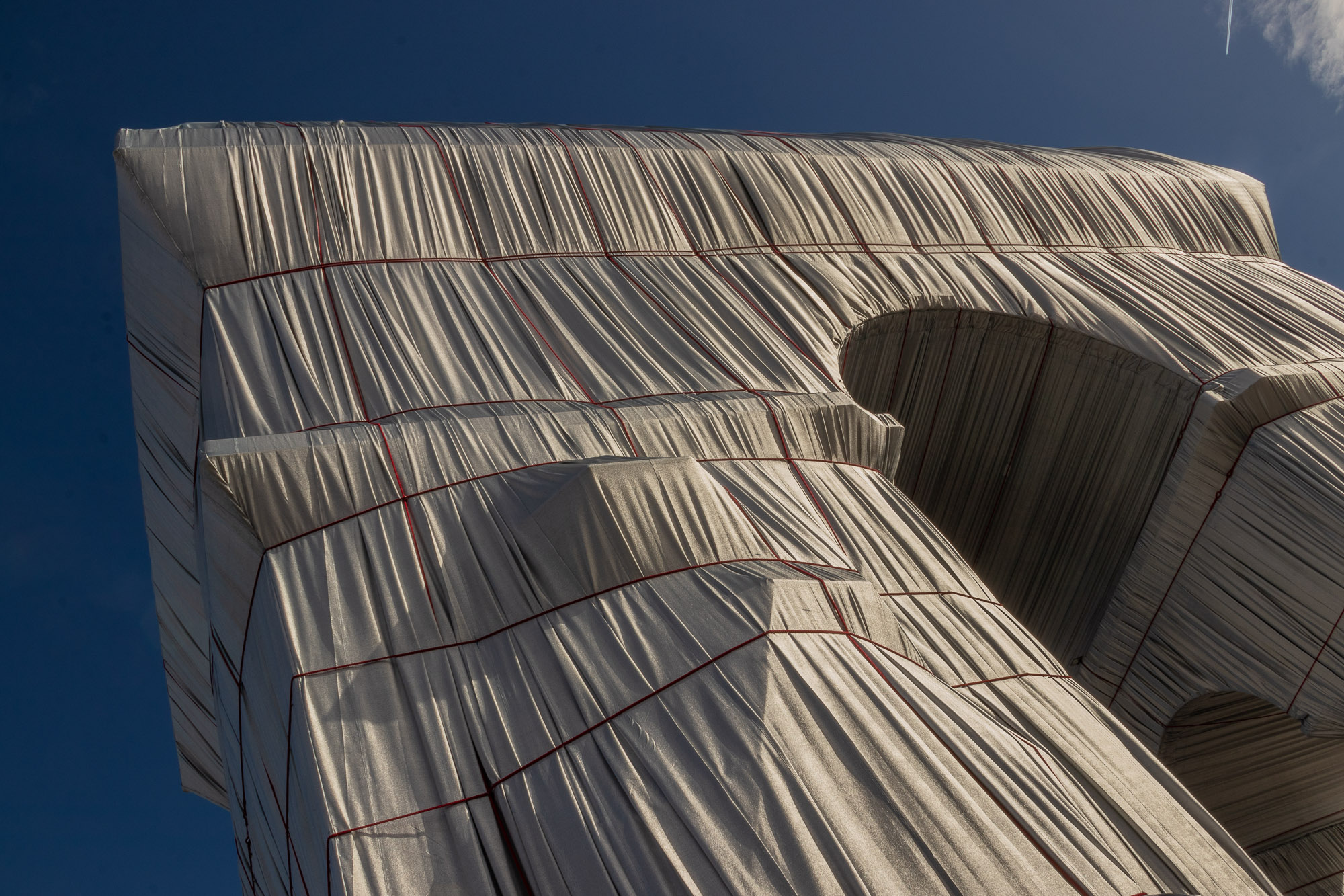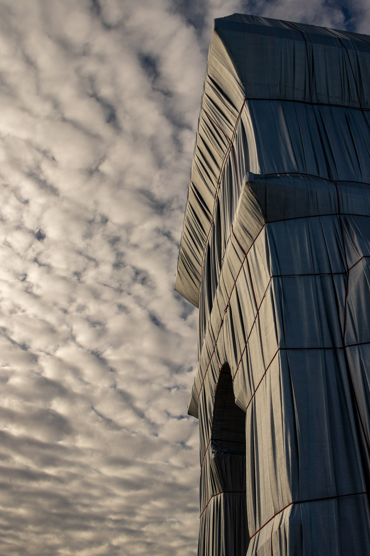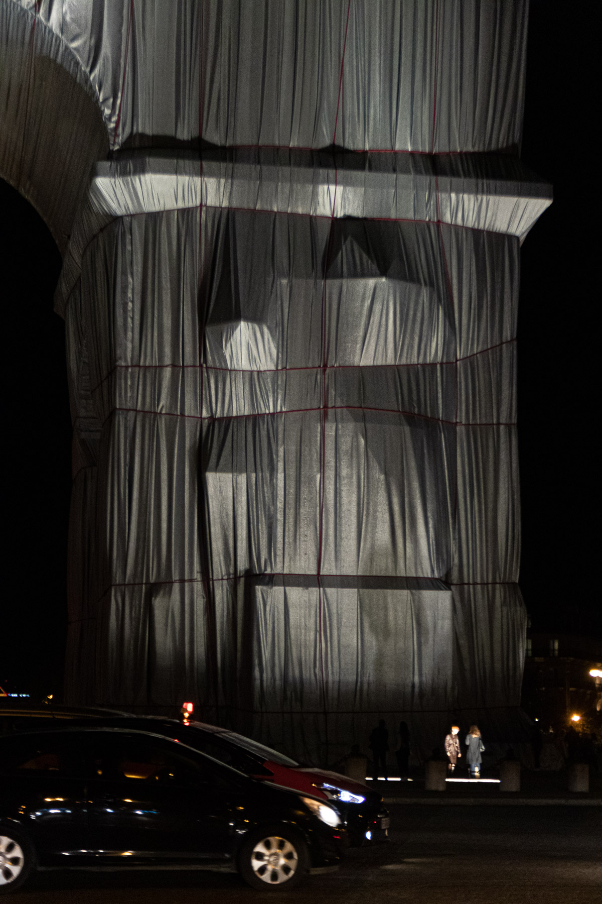 Le matériau argenté prend la lumière du jour de manière remarquable. Il créé des jeux de brillance et de reflets selon le point de vue sur l’Arc de Triomphe. Enfin, il accentue le volume du drapé sur le monument avec la direction des rayons de soleil, comme ici en fin de journée.