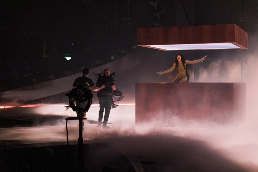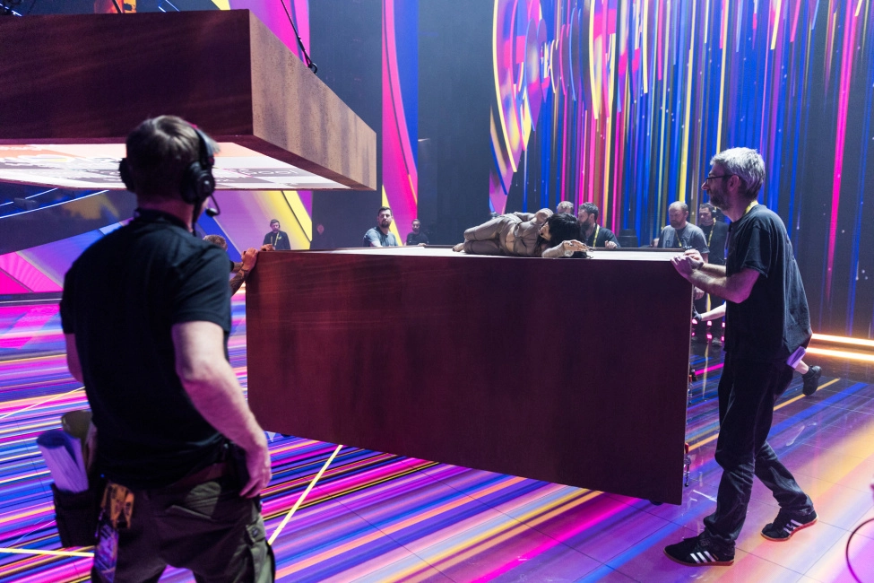 Eurovision 2023 – Behind the scenes at the rehearsal for the Grand Final of Eurovision 2023 in Liverpool – bottom screen © Corinne Cumming, EBU