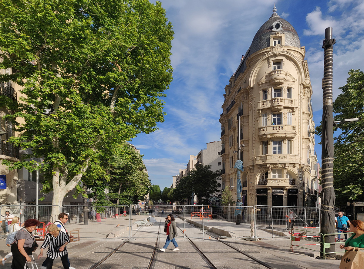 Dans le cadre d’un projet d’aménagement en ville, les alignements urbains sont stratégiques, selon Mathieu Coquet. Ils sont conçus par l’agence STOA pour transformer l’espace public. L’ajustement des grandes émergences comprend des arbres, des mâts d’éclairage et des mâts de la ligne de contact qui alimentent les tramways.