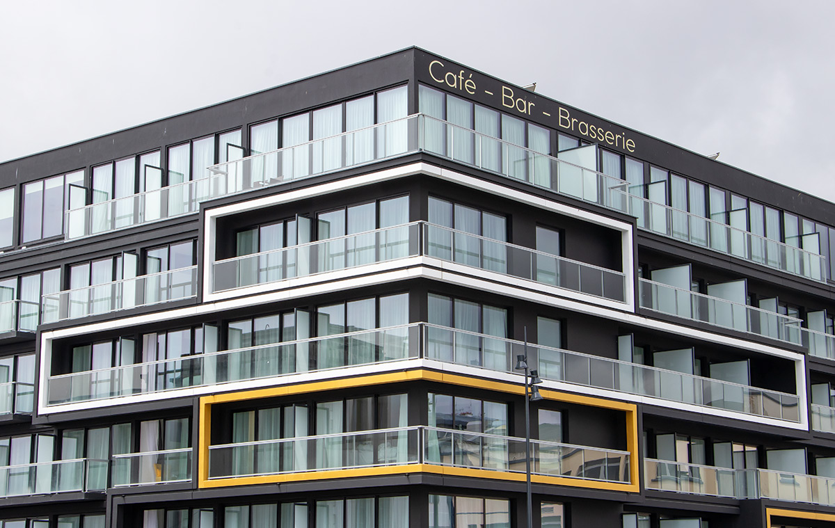 Retour à terre et à pied sec, sur la façade de l’hôtel Barracuda & SPA. C’est l’œuvre de l’agence d’architecture brestoise, A3 Argouarch Architectes Associés. Allez prendre un verre ou déjeuner dans son restaurant panoramique La Croisette.
