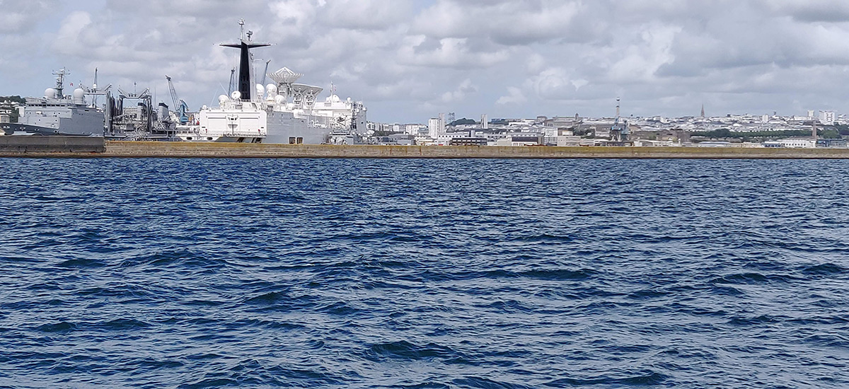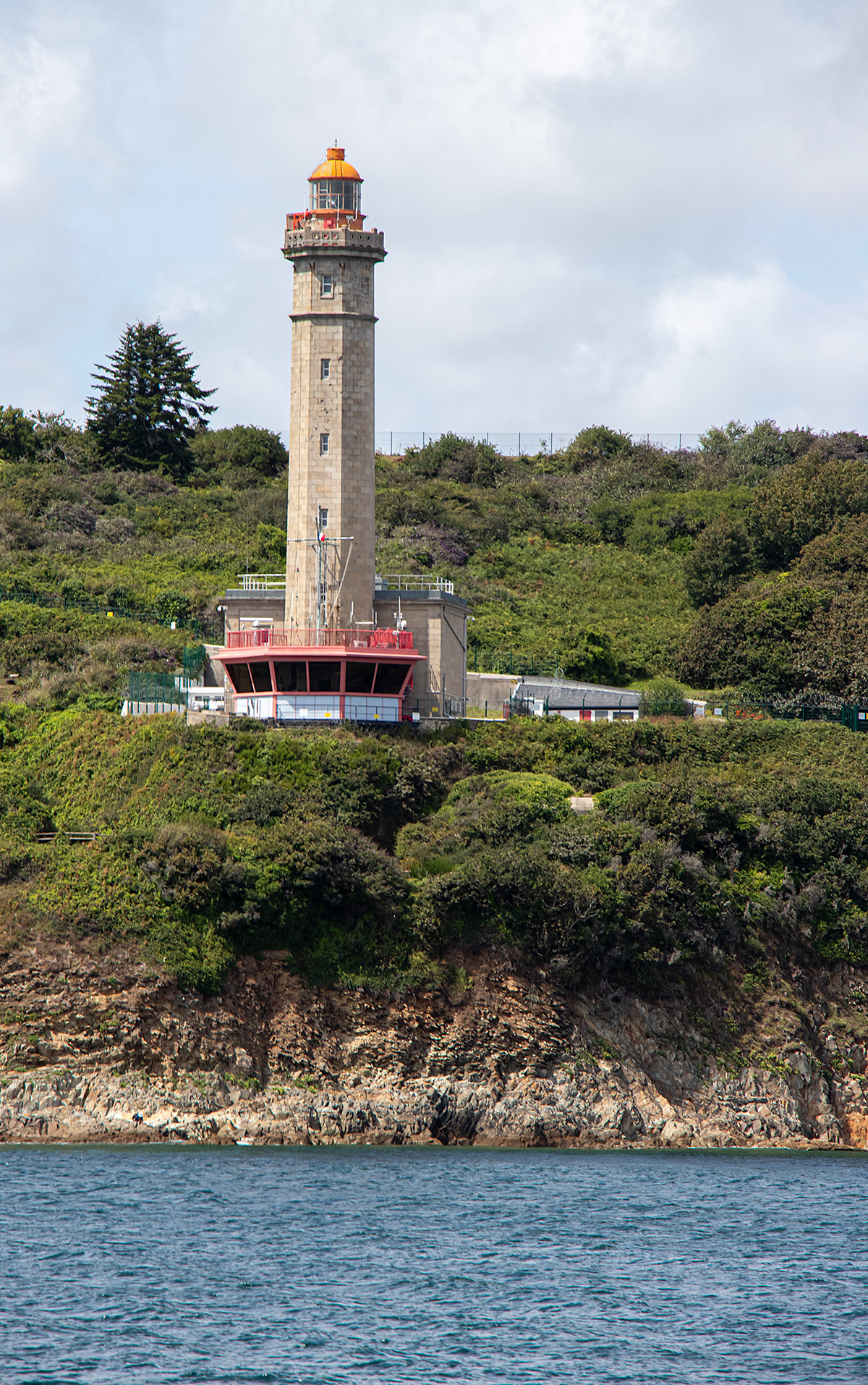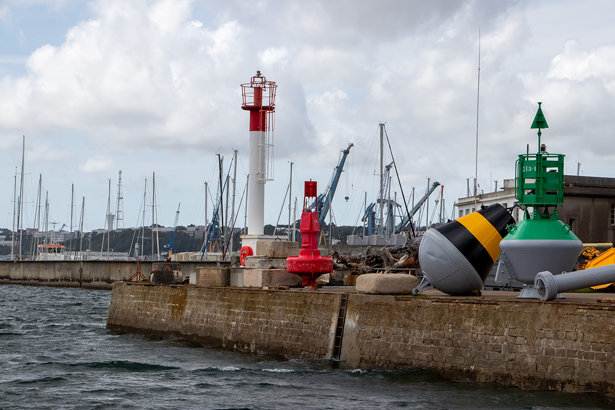 À la sortie du port de commerce, les balises de couleurs vives attirent mon attention. Après avoir longé le vaste port militaire jusqu’au la base sous-marine, la vedette suit la corniche jusqu’au phare du Portzic, à l’entrée du port de Brest.
