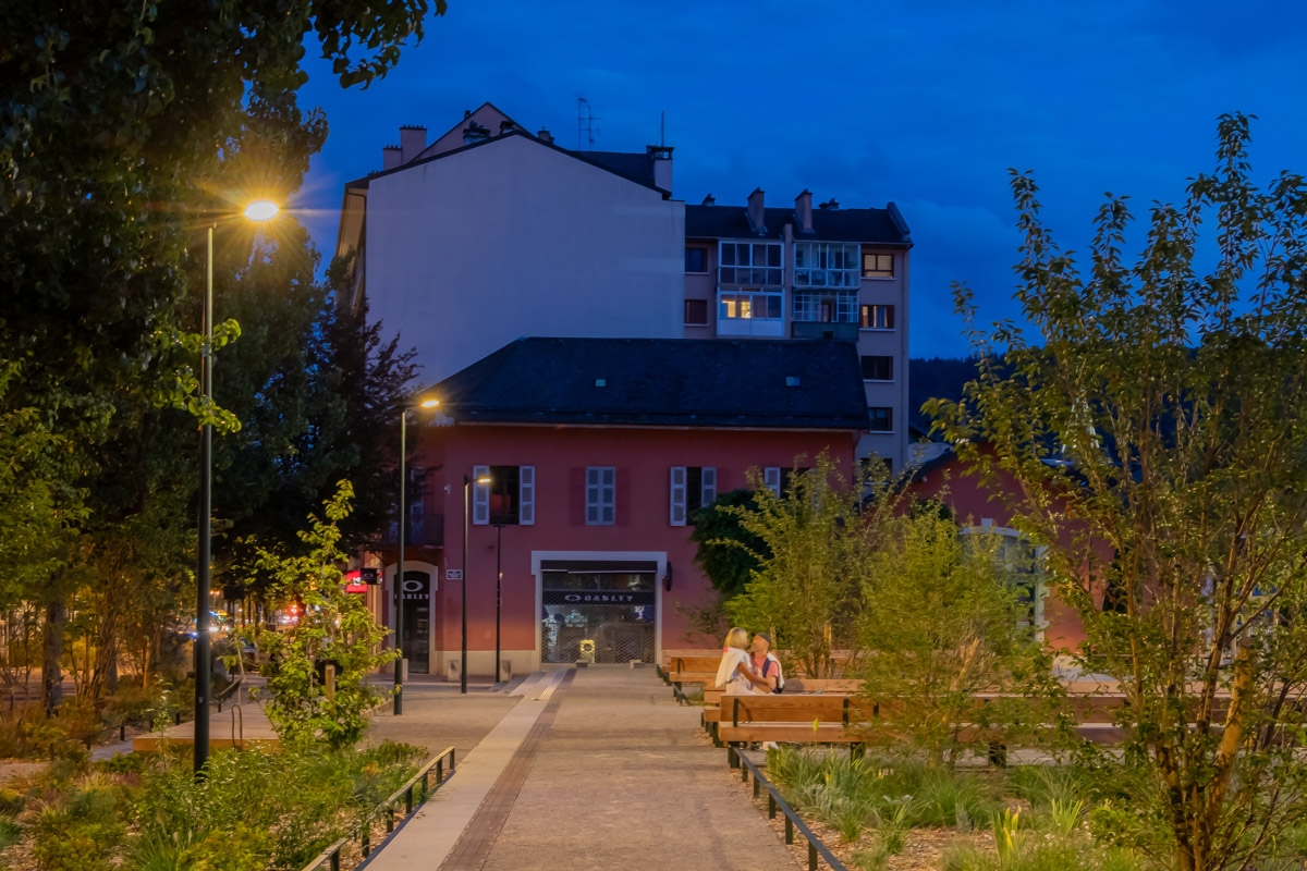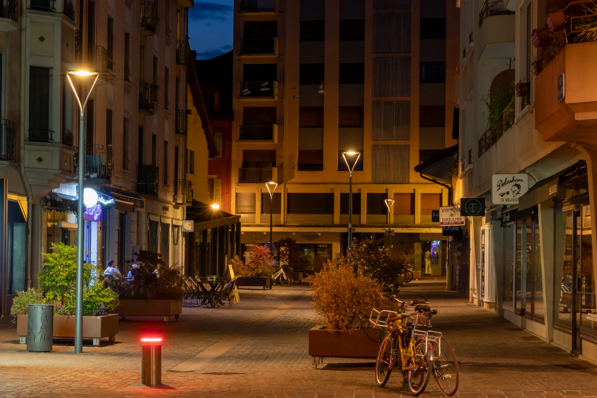 Les températures de couleur varient selon la zone, entre 2 700 K dans la rue de la Paix, désormais piétonne, et 3 000 K sur la place François-de-Menthon. Ces choix de LED sont favorables à la biodiversité.