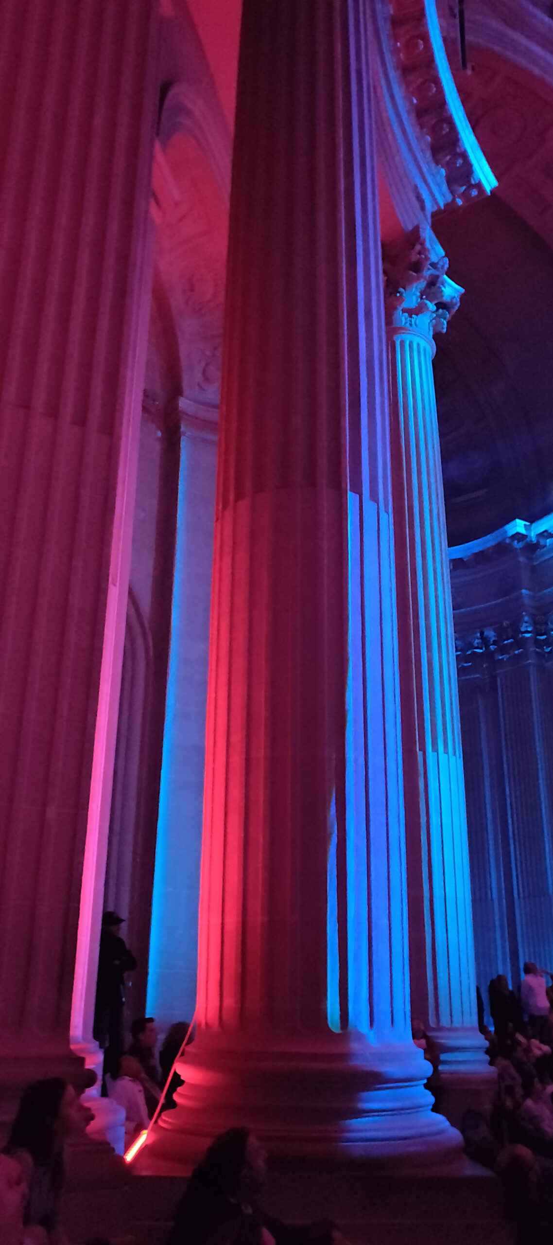 L’implantation lumière des réglettes LED s’effectue principalement à l’intérieur du dôme. Il est éclairé en lumière rasante et directe depuis le péristyle. Chaque arc à caissons ornés de sculpture est ainsi accentué.