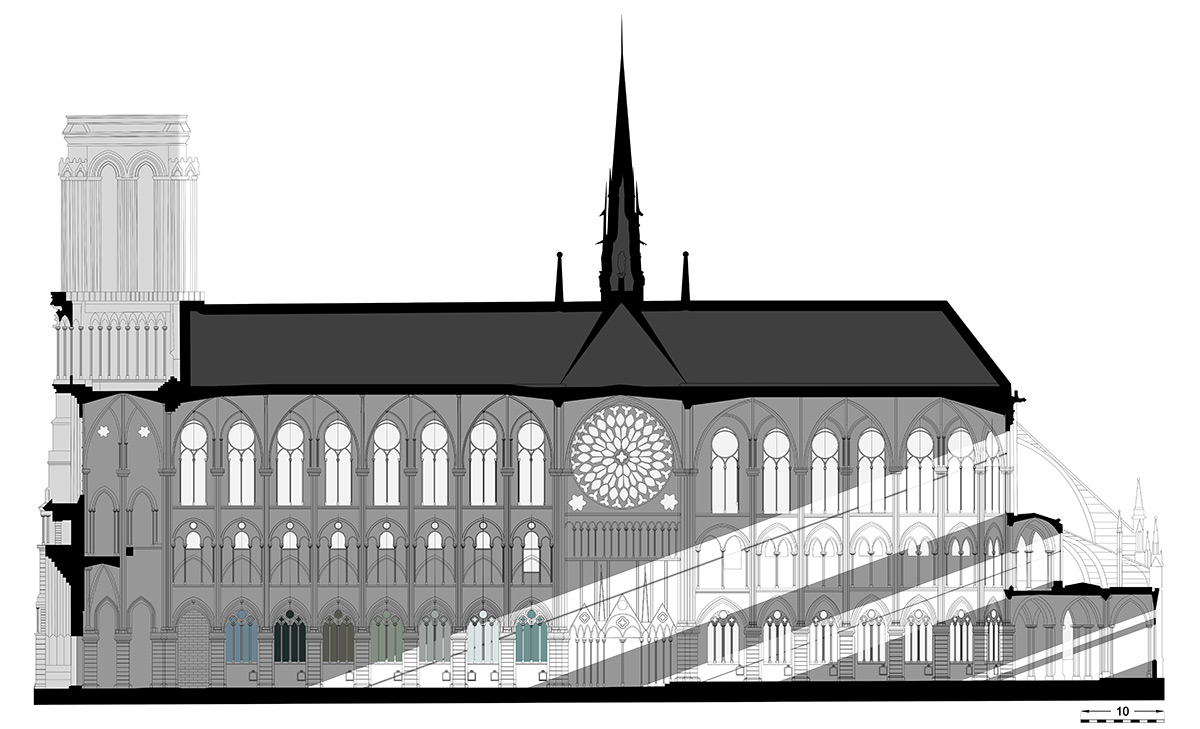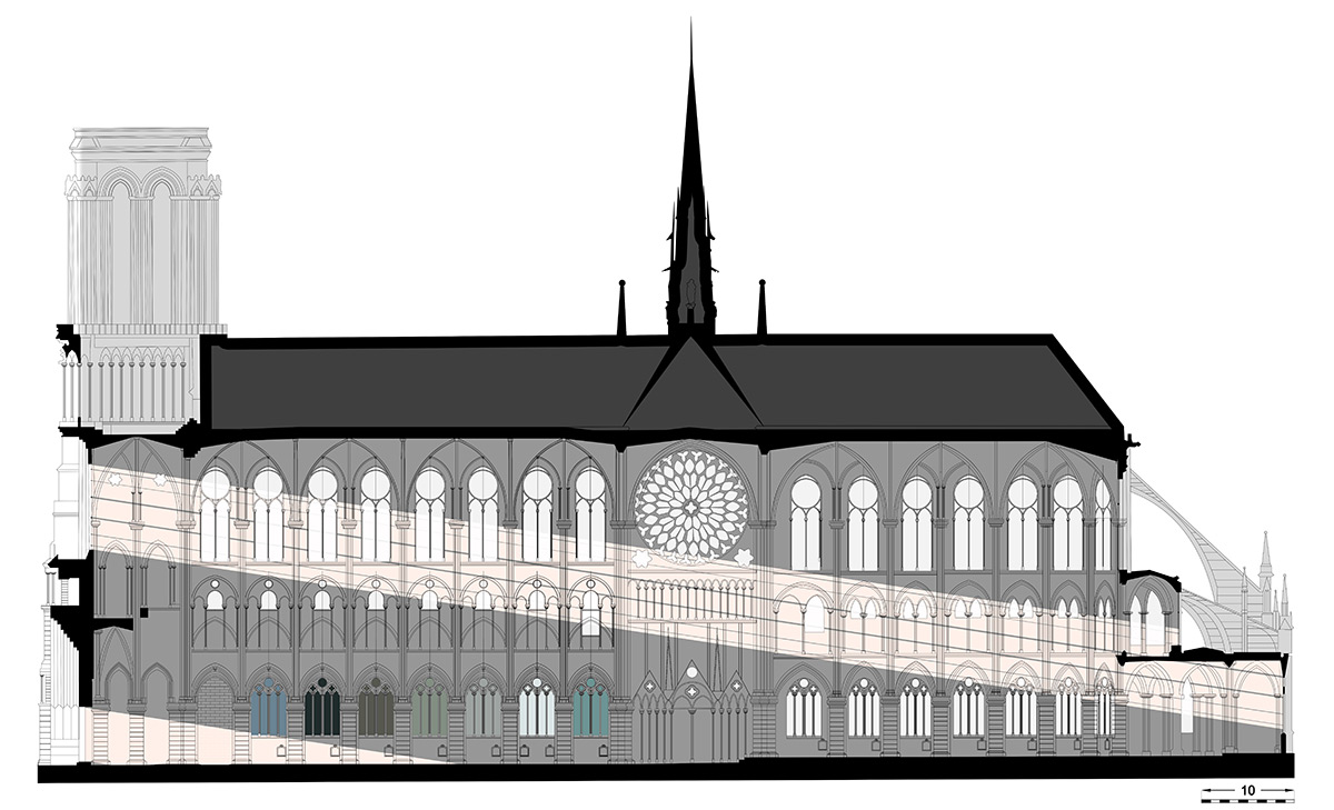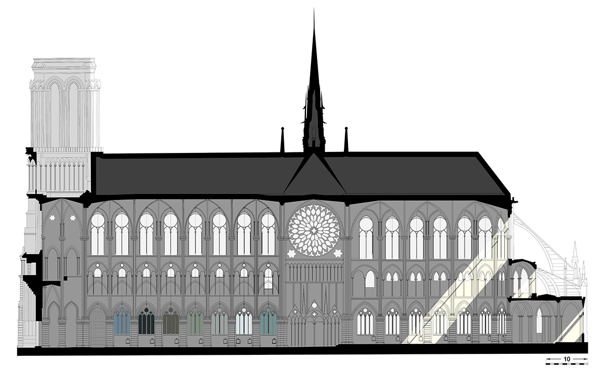 Les architectes des monuments historiques d’aujourd’hui, Philippe Villeneuve, Rémi Fromont et Pascal Prunet ont alors décidé un grand nettoyage intérieur postincendie. Au-delà de la reconstruction de la charpente à l’identique en bois et de la flèche de Viollet-le-Duc sous la toiture, c’est ce qui frappe le plus quand on entre à présent dans Notre-Dame.