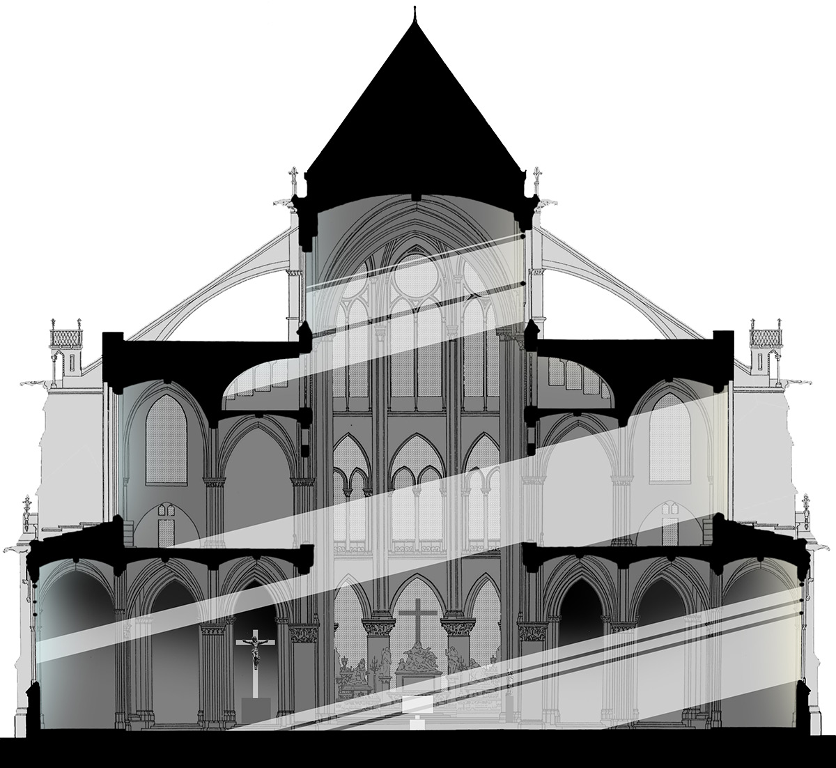 Patrick Rimoux : Un dialogue essentiel a été établi avec la lumière lors de la construction de la cathédrale. Pourquoi et comment a-t-elle été orientée en fonction des solstices ? C’était une première partie de l’étude sensorielle du bâtiment. Comment et pourquoi a-t-il été construit ? Comment la lumière entre en été et en hiver ?