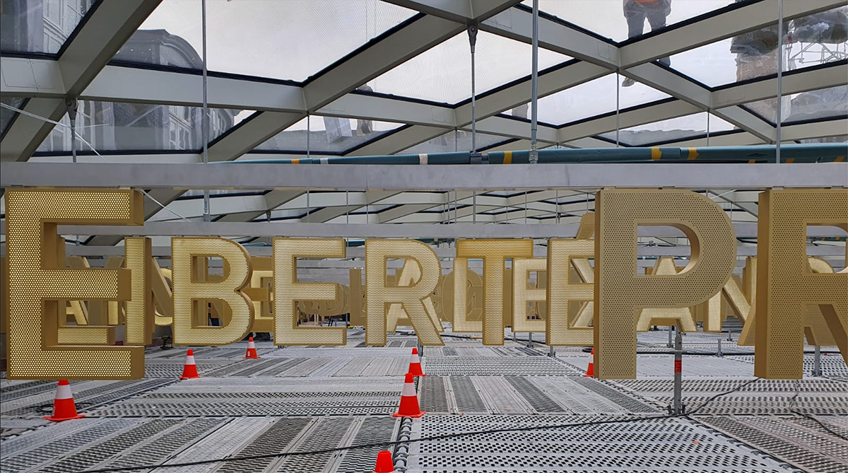 Le fabricant de signalétique et d’enseigne sur-mesure Boscher a réalisé ce ciel lexical. Il est composé de 110 mots et 797 lettres lumineuses en aluminium perforé et anodisé. Les réglages d’alignement sont effectués par rotules de chaque côté des perches.
