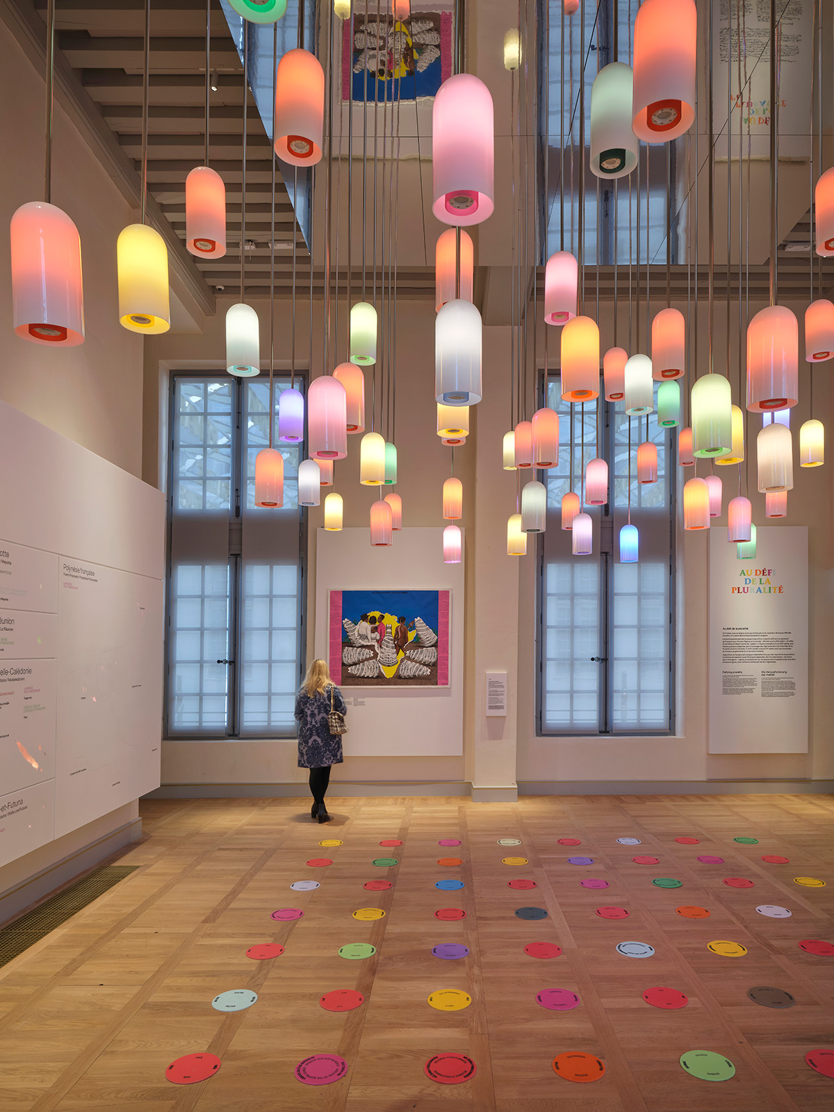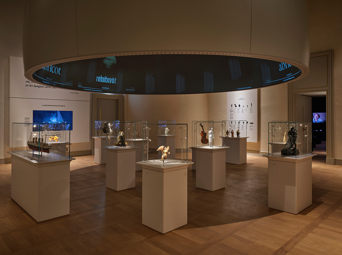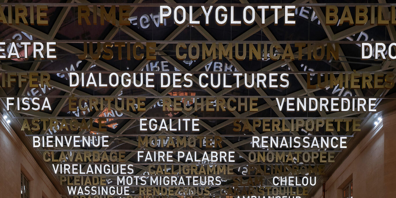 Le parcours est pensé comme une aventure à vivre. Dès l’entrée, la cour du Jeu de Paume révèle un « ciel lexical » lumineux : 89 mots suspendus, composés lors d’ateliers citoyens, plongent le visiteur dans la richesse et la diversité linguistiques.