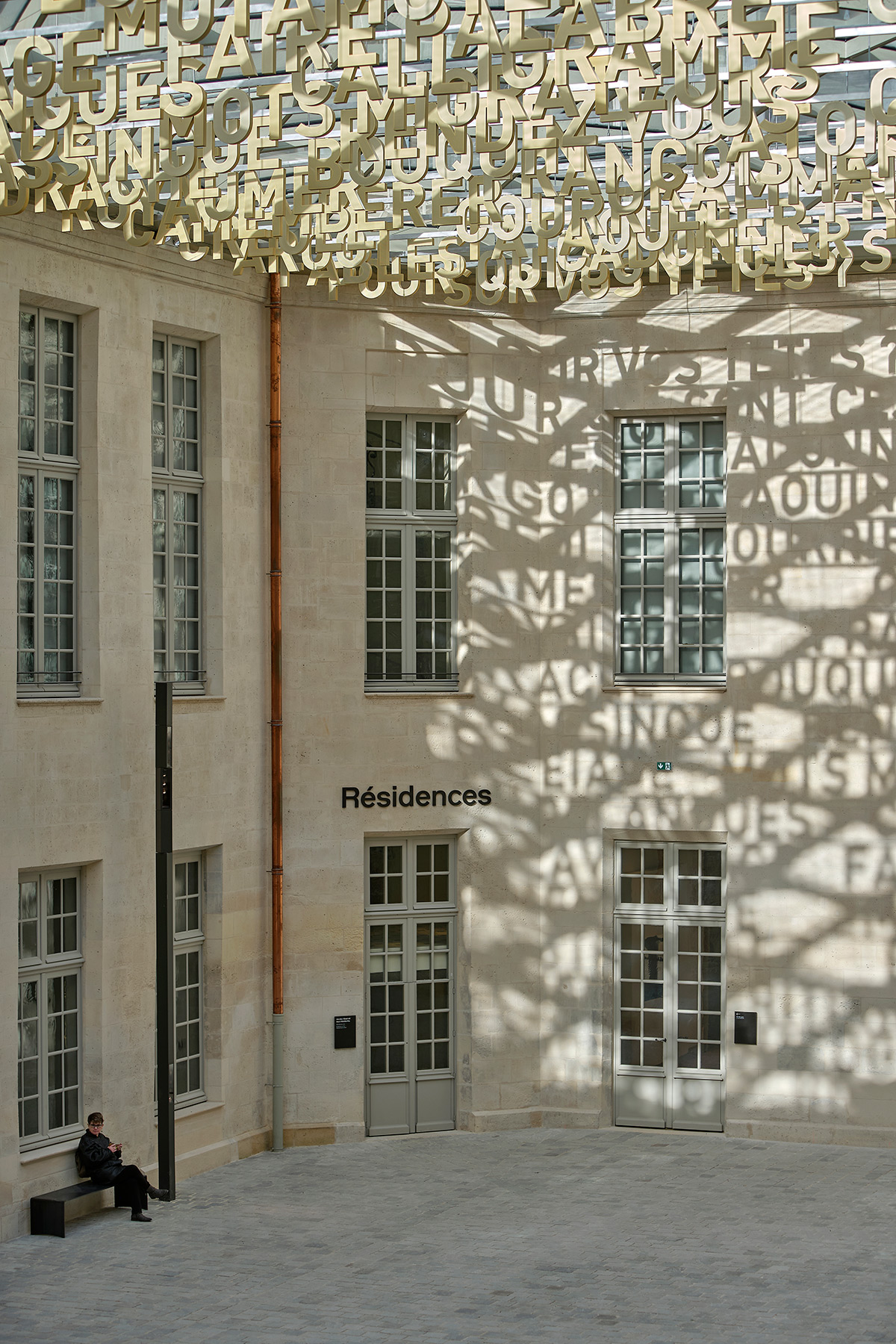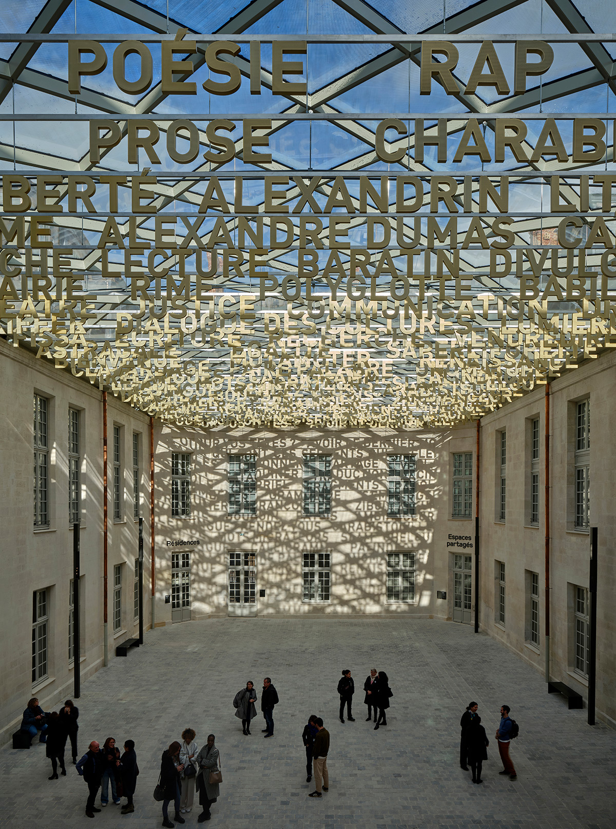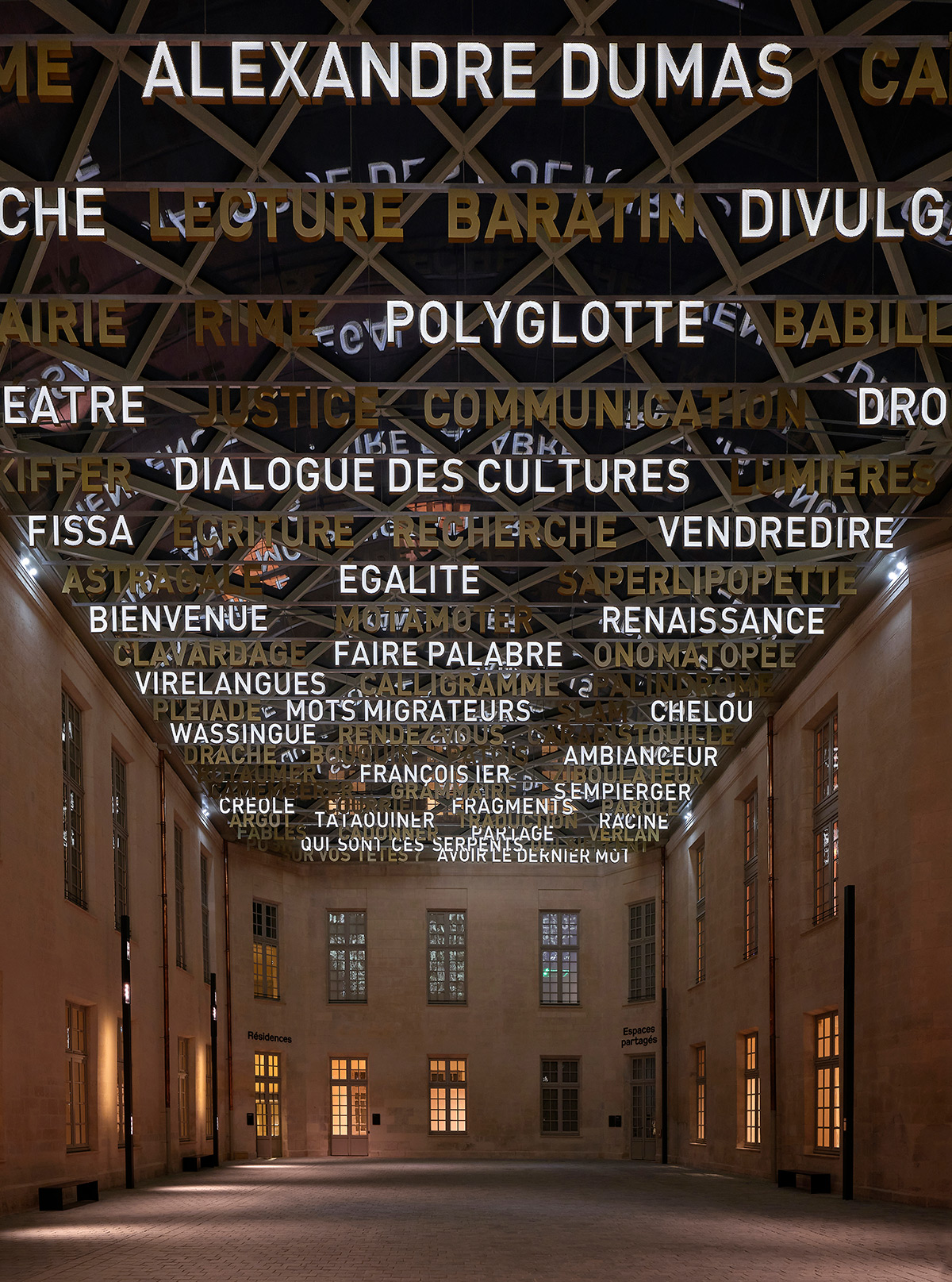 Suspendus à une impressionnante verrière de 17 x 33 m, les ensembles de mots et des lettres sont fixés à des profils métalliques. De jour, avec les rayons du soleil, ils créent des ombres portées. La langue se projette en négatif et investit réellement le cœur de la Cité.
