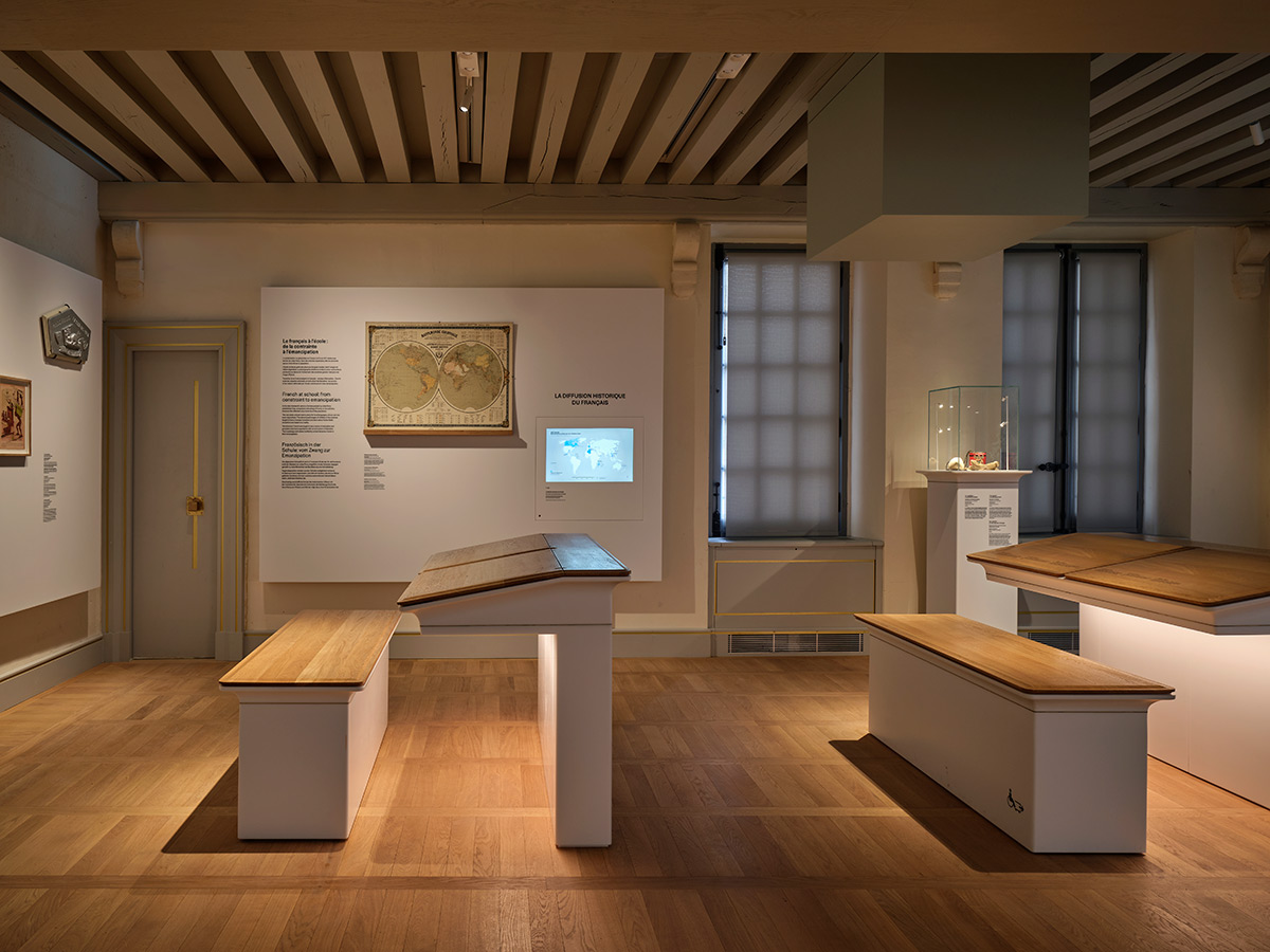 Dans ce lieu chargé d’histoire, l’exposition permanente de la Cité Internationale de la Langue Française propose une immersion sensorielle au cœur de la francophonie et de son évolution. A travers quinze salles thématiques, elle est orchestrée par l’agence Projectiles dans 1 200 m² du Château de Villers-Cotterêts.