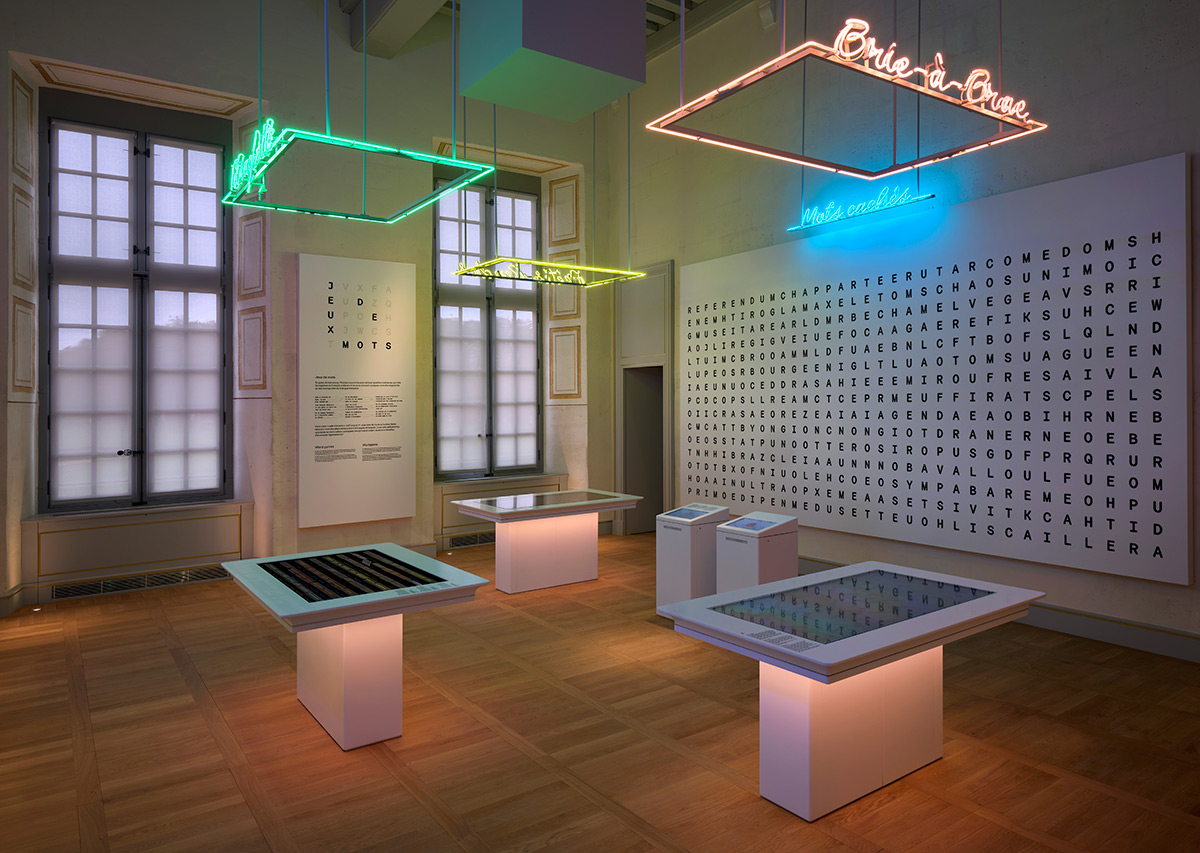 Dans la salle dédiée au jeu, le visiteur est plongé dans un univers de lettres du sol au plafond. Un immense mot mêlé en trois dimensions invite à découvrir des mots depuis l’espace central. Elles ont été réalisées par le néoniste Trois Lumières Blanches. Numériques ou mécaniques, selon les envies, six types de jeux sont accessibles pour un à quatre joueurs.