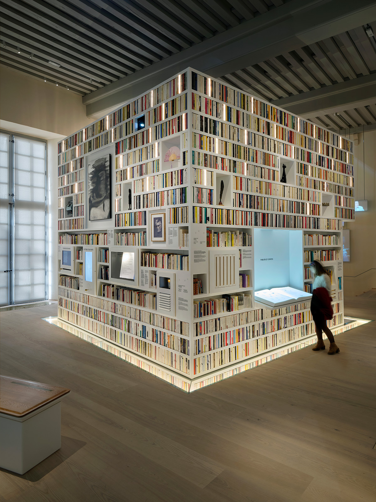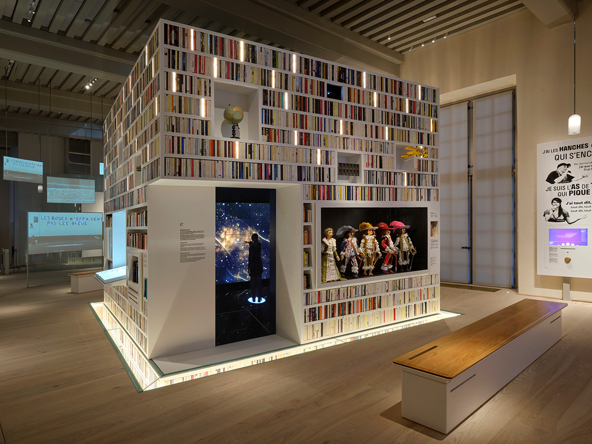 Parmi les œuvres phares, la « bibliothèque magique » attire tous les regards. En son cœur, elle possède un espace numérique interactif. Véritable cabinet de curiosités, cette installation monumentale expose de 2000 livres issus de toute la francophonie. Certains dos de livres sont lumineux.