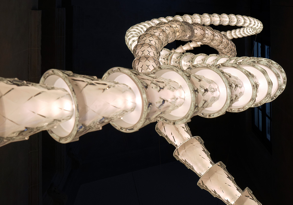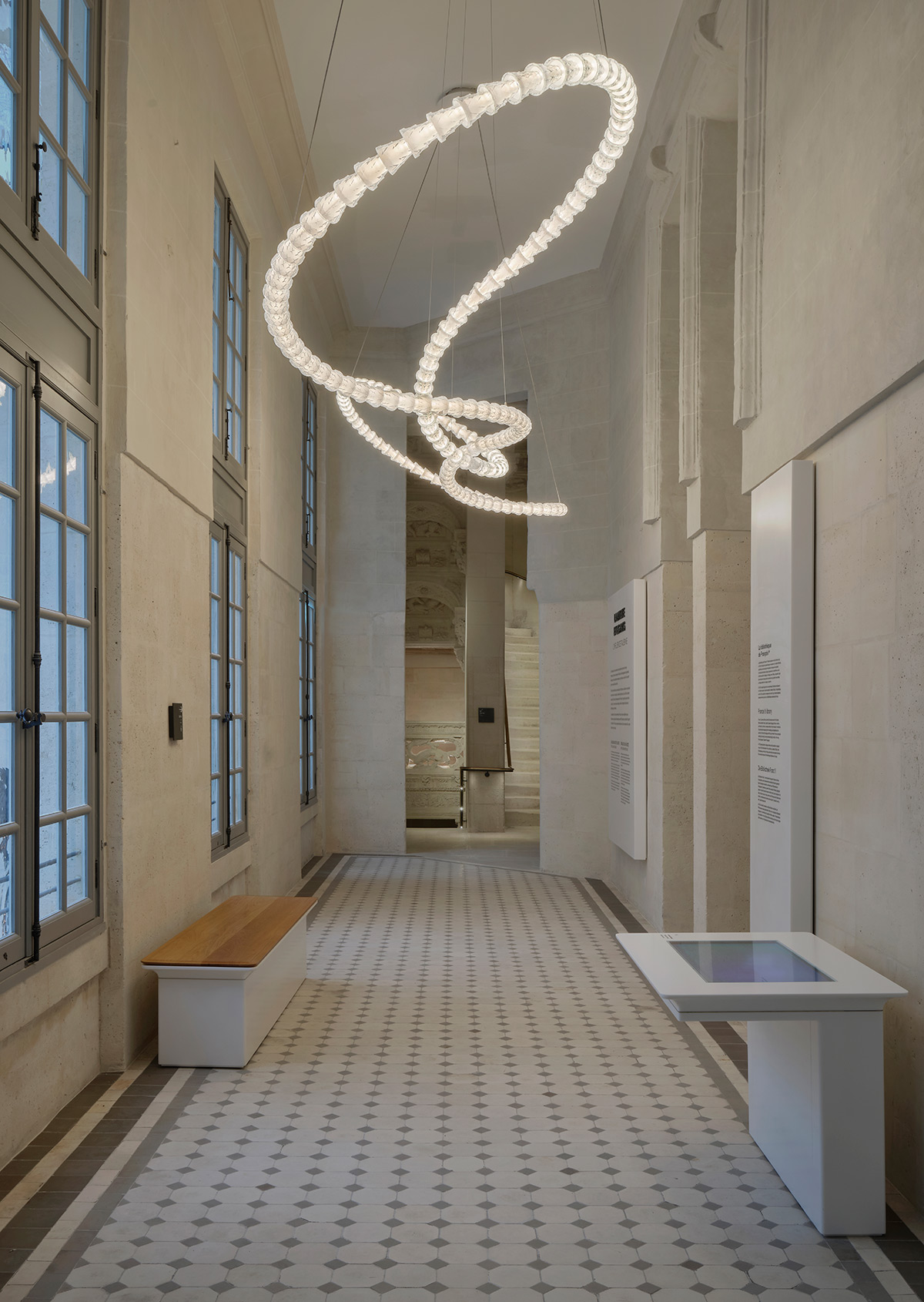 La chapelle et sa galerie bénéficient d’un traitement singulier : un contraste entre vide et plein. Dans la galerie, un lustre monumental Lucien Gau en forme de ruban de verre est inspiré de celui du Château de Fontainebleau.