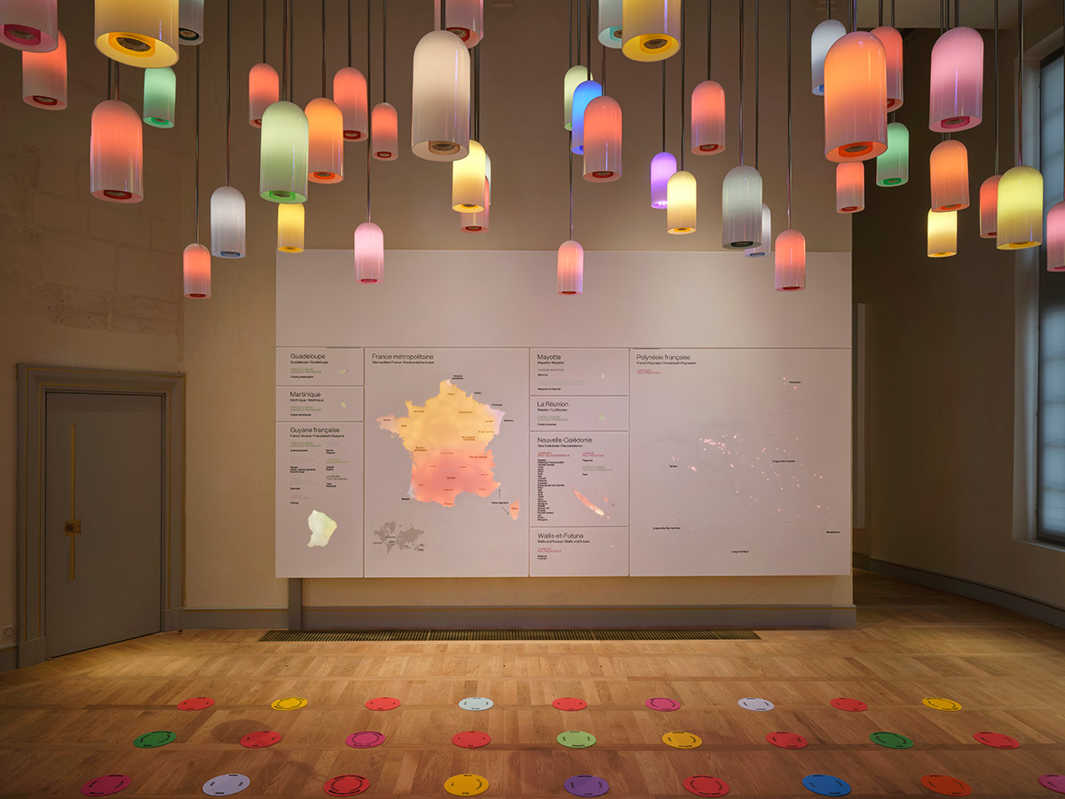 Dans une salle dédiée à la pluralité linguistique, soixante-douze suspentes lumineuses diffusent des couleurs acidulées. Elles émettent aussi des enregistrements des langues régionales françaises officielles et affichent leur répartition. Comme pour les tranches de la « Bibliothèque magique », il s’agit d’une fabrication sur mesure de l’installateur Satelec » précise Salomé Loyer, responsable projet senior de 8’18’’.
