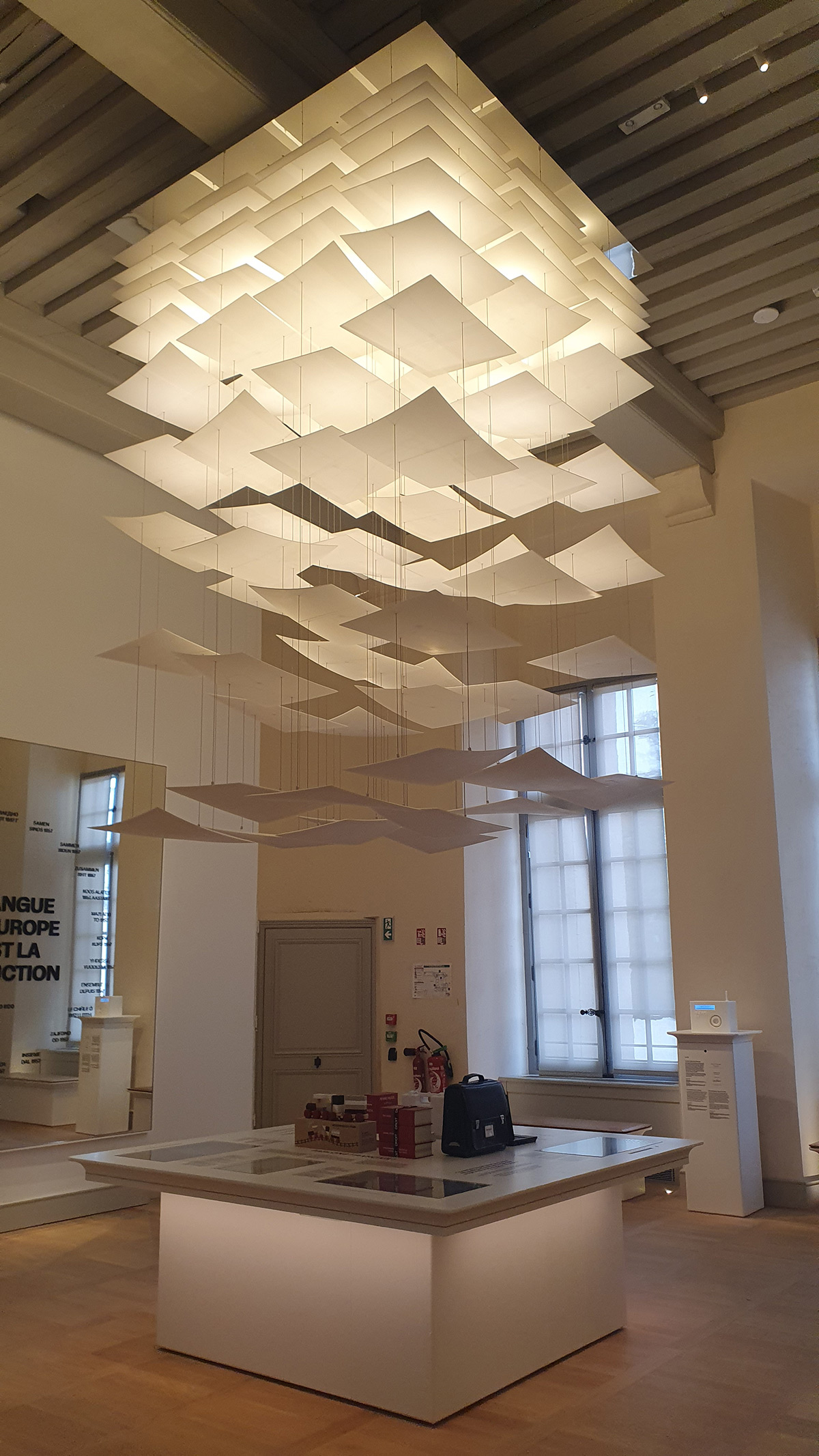 Au centre de la salle des enjeux contemporains, un lustre volumineux de l’agenceur Sequoia suspend des pages qui s’égrènent. L’éclairage zénithal combiné à la lumière naturelle, elle met en valeur un texte constitutionnel entouré d’anglicismes. Un miroir présente la diversité linguistique européenne traduisant le slogan dans toutes les langues officielles.