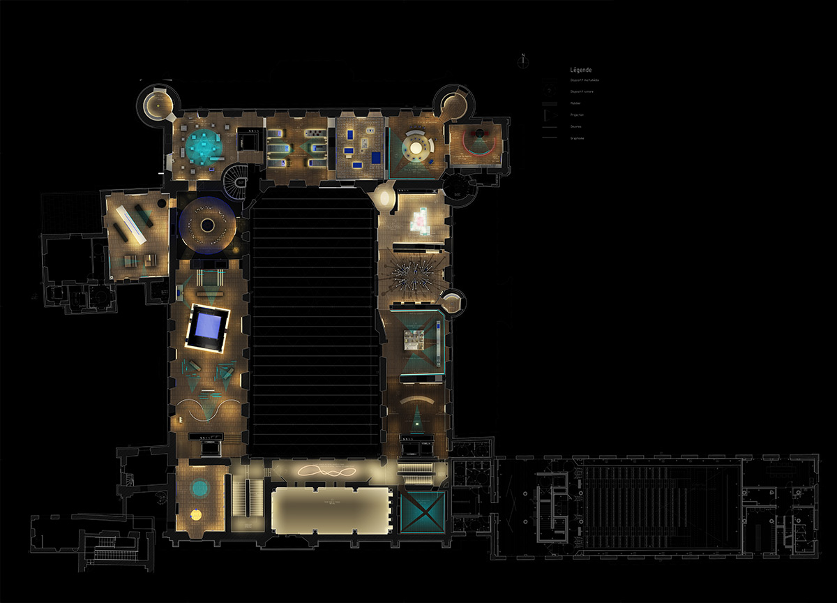 Au rythme du parcours, les scénarios de lumière adaptent la narration. Les lustres et les suspensions peuvent varier d’intensité. Dans chaque pièce, la lumière est synchronisée avec le son, la vidéo projection et les dispositifs interactifs pour renforcer l’immersion du visiteur dans l’expérience proposée.
